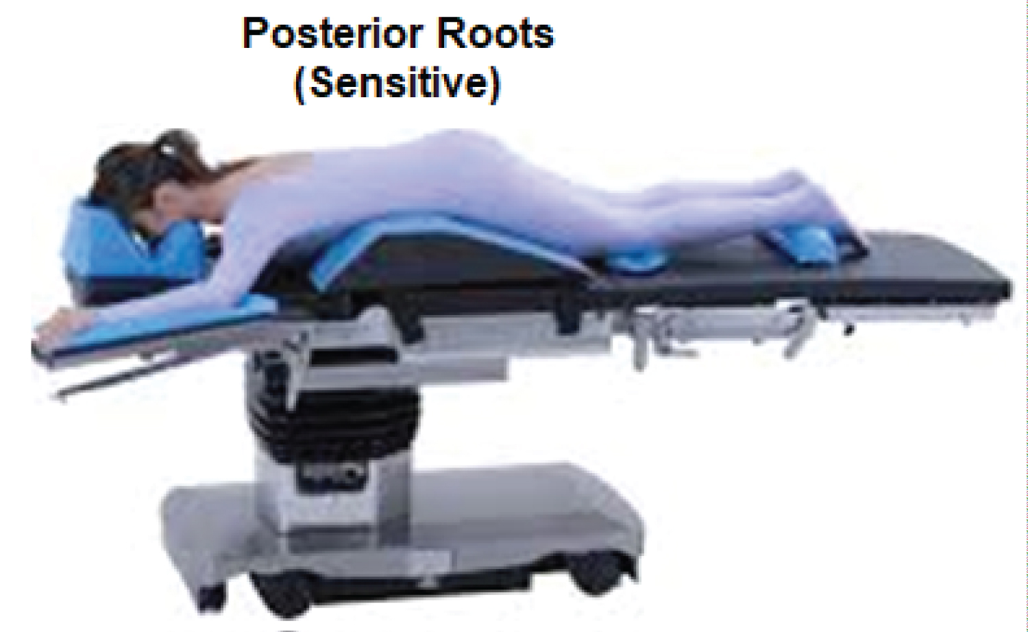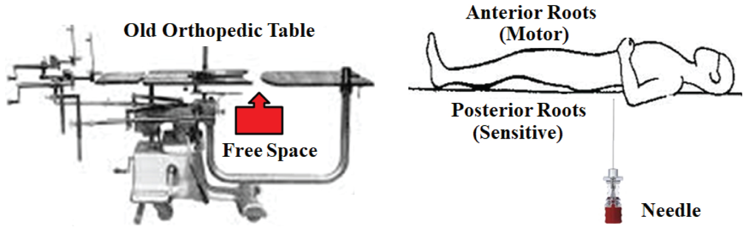 There are several positions to perform puncture of the subarachnoid space the most common are in sitting and lateral decubitus (Figure 1). However, there are two more important positions to perform other types of spinal anesthesia such as the prone position (Jack-knife position) (Figure 2) and in some patients operated on old orthopedic surgical tables, where there is a space between the back and the buttocks, the puncture can be performed in supine position with the needle inlet under the table (Figure 3).