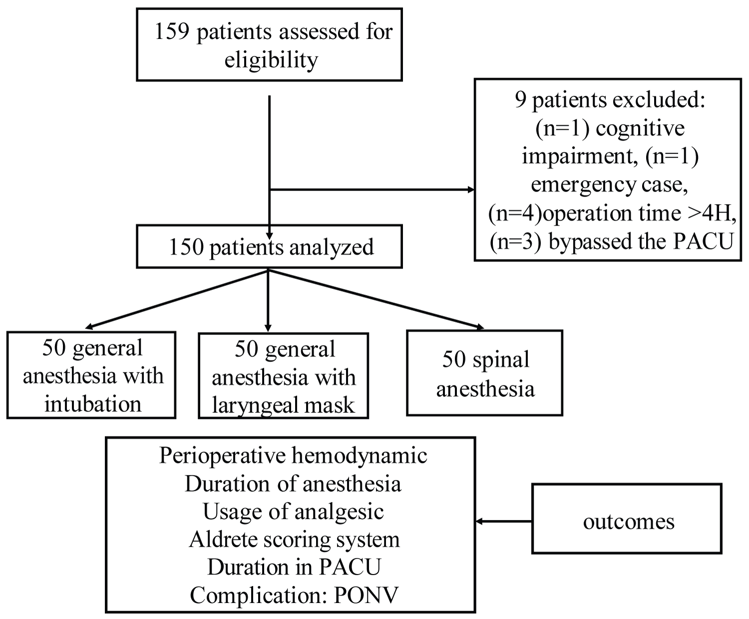 Methods: Retrospect chart study of 150 patients scheduled for procedures in a day surgical center using various anesthetic techniques. The cases were classified into three groups, and each anesthesia method had a total of 50 patients, that is, general anesthesia with endotracheal intubation (ETT) and general anesthesia with laryngeal mask airway (LMA), and spinal anesthesia (SA). The primary outcome was the discharge time from the post-anesthesia care unit (PACU), the secondary outcomes included perioperative hemodynamics, analgesia usage, the Aldrete Score, the incidence of postoperative nausea and vomiting (PONV), and other complications.