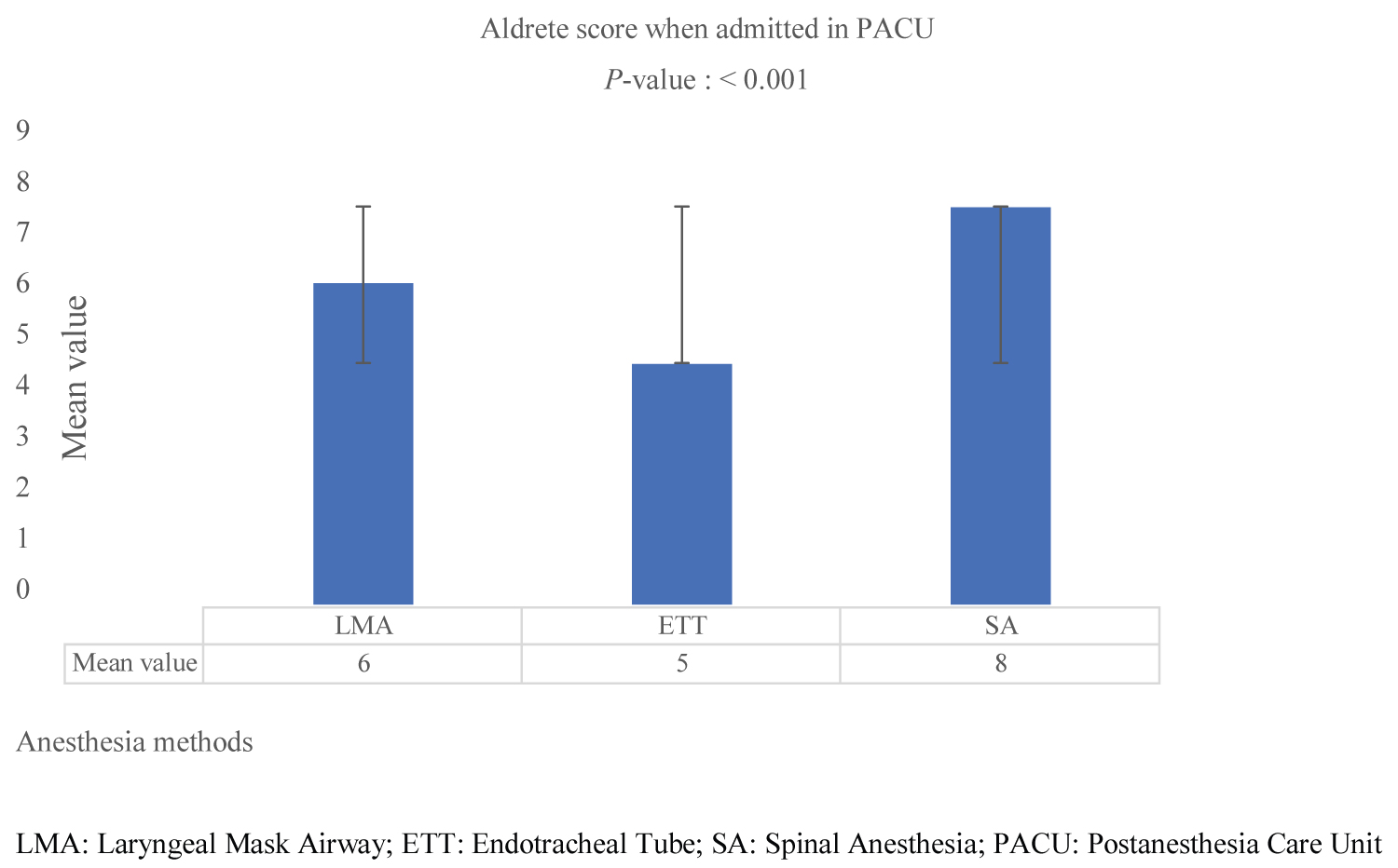 The Aldrete scoring system by the time of admission in PACU patients between the three groups was as follows 8, 6, and 5 mean values for SA, GA with laryngeal mask, and GA with intubation, respectively, with P < 0.001 (Figure 3). However, the comparison within the groups showed statistical significance between them GA with a laryngeal mask GA with intubation and spinal anesthesia.