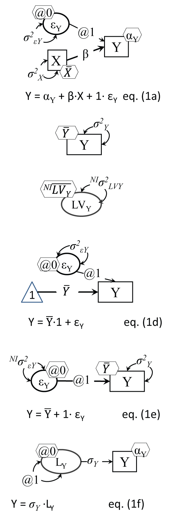We distinguish between estimated and fixed model parameters, so that only one such visual depiction would be needed to represent both the input and the output (estimates) of a statistical model. When a residual error is specified for instance, like in Figure 1a, which translates visually a simple regression of Y on X, its loading is set to 1, labeled '@1' (to define its scale identical to its observed 'anchor' Y), and its mean is set to zero (because it cannot be identified otherwise); the direct equation translation of a structural model is then obtained by simply selecting an effect (Y) and adding up its causes (predictors), multiplied by their respective path/causal coefficients, e.g. for Figure 1a Y= αY + β.X + 1.εY. Note that the equation form has less information than the visual model, because one has to also acknowledge in equation form the assumptions Y = 0 and ρXεY = 0. We remind the reader that in a regression the variance of the predicted variable is not a model parameter, instead the variance of its residual error is estimated; similarly its actual mean is not estimated, but its intercept is, i.e. its mean if/when the predictors become zero.