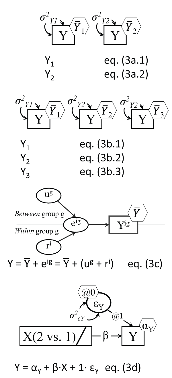 Another way to intuitively grasp the logic of Anova is to depict the decomposition of the error of a variable into its between-group and within-group components, as in Figure 3c. In fact this decomposition is the basis of two-(and multiple) level models, which in Mplus for example are run with no other model specification than 'Analysis: Type=basic twolevel;'. Anova can of course be tested using a regression setup [29], using binary predictors to contrast the groups that are the focus of comparison (see Figure 3d); this setup confesses openly the causal assumptions behind the analysis, i.e. that the grouping variable is the source (cause) of the differences in means of the 'dependent variable', as it is specifically labeled in software like SPSS [30].