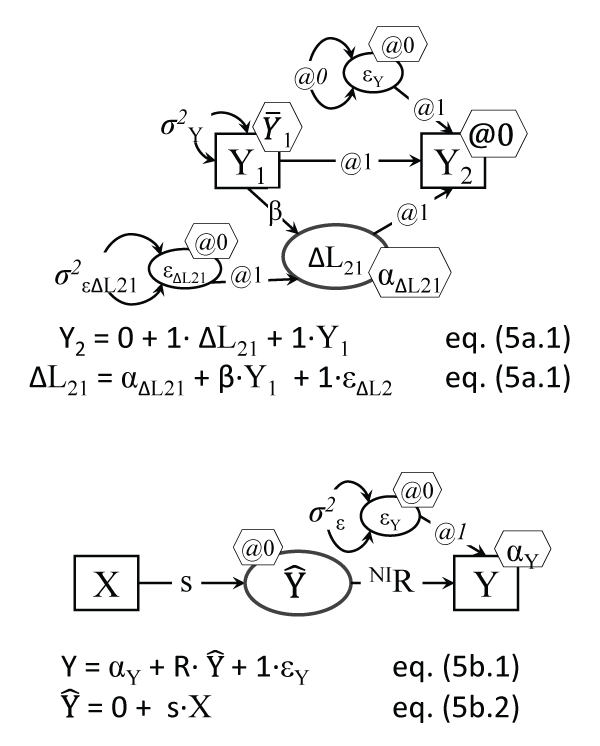We have shown before that the latent change score (LCS) can fully replicate the paired t-test [31], and since latent growth models (LGM) are a particular case of LCS ones [35], LCS can handle LGMs and then can even expand them with additional features (like dynamic relations). While the LCS setup in Figure 5a may appear complex, the model is rather intuitive: a change score (as an LV however, not a mere calculated difference score) is created by tricking the software into literally doing the desired subtraction ΔL21 = Y2 - Y1, but by adding up two causes of the later variable Y2: the prior values Y1 and the 'change mechanism' ΔL21: Y2 = ΔL21 + Y1.