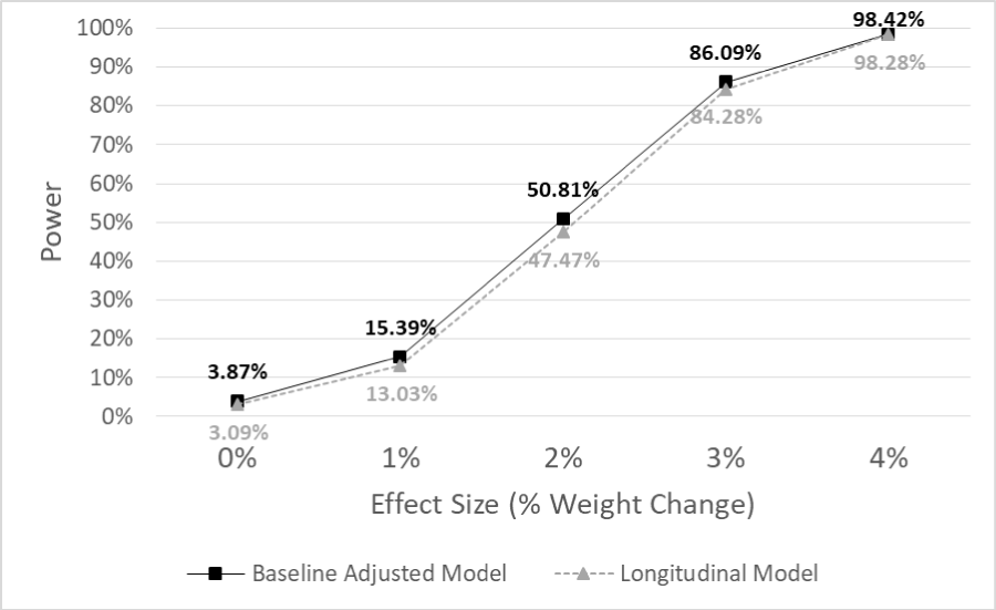 Although the power is slightly lower in the longitudinal arm, the type I error rate is also lower in the longitudinal model, 3.09%, compared to 3.87% in the baseline-adjusted model. The primary effect size of interest was 3%, as the prospective study hypothesized that the treatment group would have an average % weight loss of 3% more than the comparison arm. For the pairwise test of treatment group vs. comparison group % weight change at month 24, the mean estimate across the simulations was -2.97% for the longitudinal model compared to -2.98% for the baseline adjusted model. The coverage probability for our hypothesized effect size was found to be 96.21% [95% CI: 96.58-95.84] compared to 94.15% [95% CI: 93.69-94.61] for the longitudinal and baseline adjusted model, respectively.