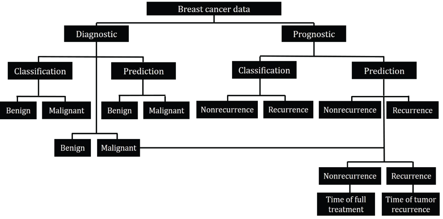 For accurate prediction, diagnostic and prognostic datasets are considered separately. The prognostic dataset is trained for classifying and predicting the recurring and full treatment cases. This prediction model is then used on the malignant cases obtained from the diagnostic dataset to predict if the tumor is recurring or nonrecurring in the patient's body. Each of these cases is then evaluated to predict the time taken by the tumor to reoccur or the time taken by the patient for full treatment. The workflow has been summarized in Figure 2.