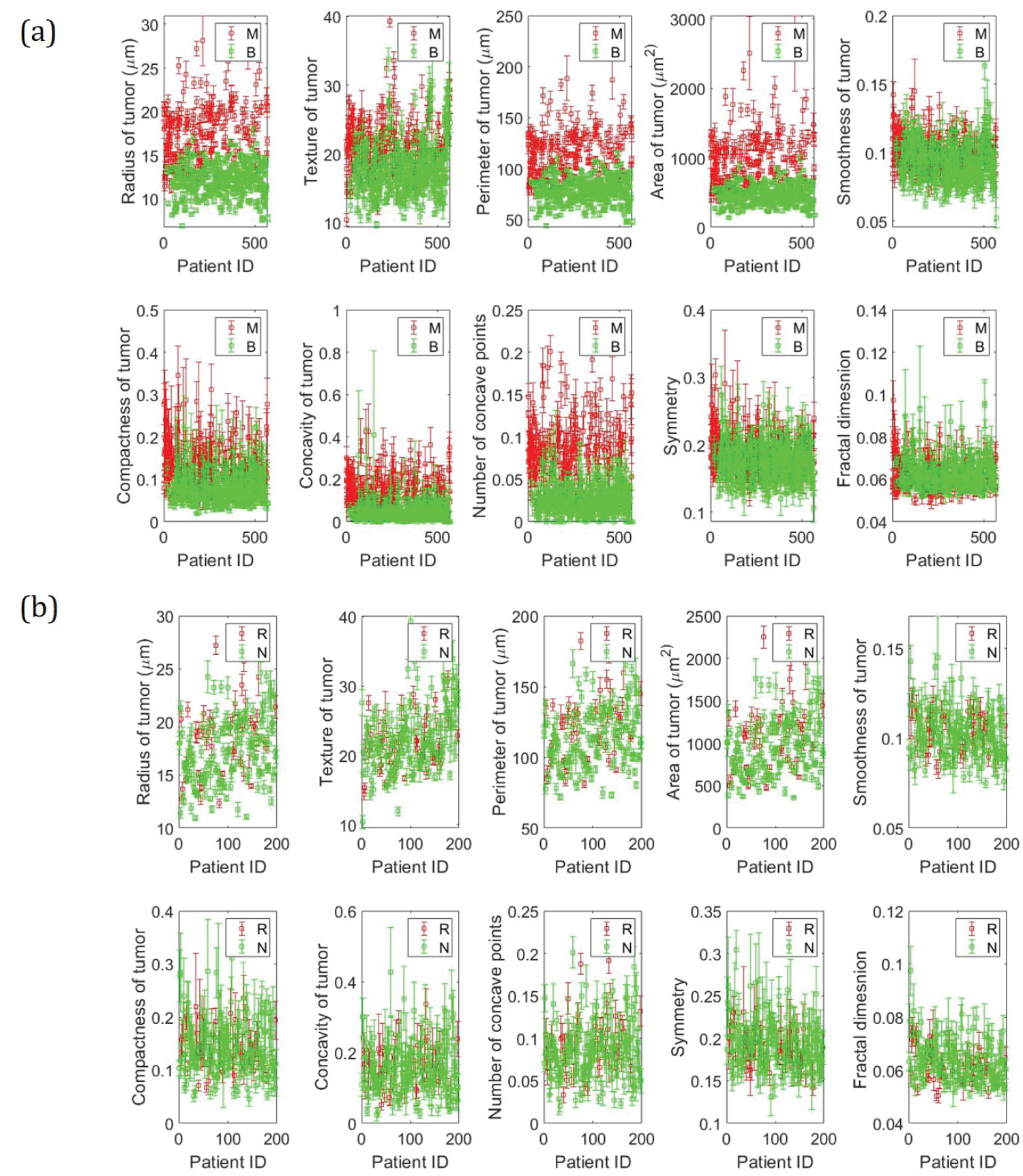 The multivariate real attributed characteristics data [25] is taken from the University of California Irvine's Machine Learning Repository (UCI). The data was collected by Dr. Wolberg WH at the General Surgery Department of Clinical Science Center at the University of Wisconsin Madison and was donated to UCI by Street N. Two different datasets are considered in this study. I) Wisconsin Diagnostic Breast Cancer data (WDBC) and II) Wisconsin Prognostic Breast Cancer data (WPBC). A digitized image of a fine needle aspirate (FNA) of a breast mass was used to obtain characteristics of cell nuclei present in the image and 30 different features were calculated for each patient. The WDBC and WPBC are 30 features datasets of 569 patients and 196 patients respectively. In addition to the feature values, the dataset also consists of the corresponding labels i.e. Benign (B) and Malignant (M) for WDBC and Recurring (R) and Nonrecurring (N) for WPBC data. The data has been summarized in Figure 3 and the mean values of the data are reported in Table 1.
