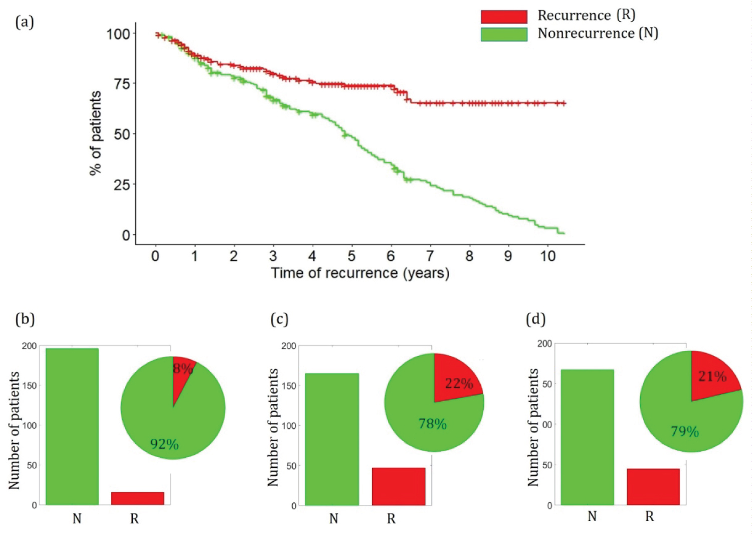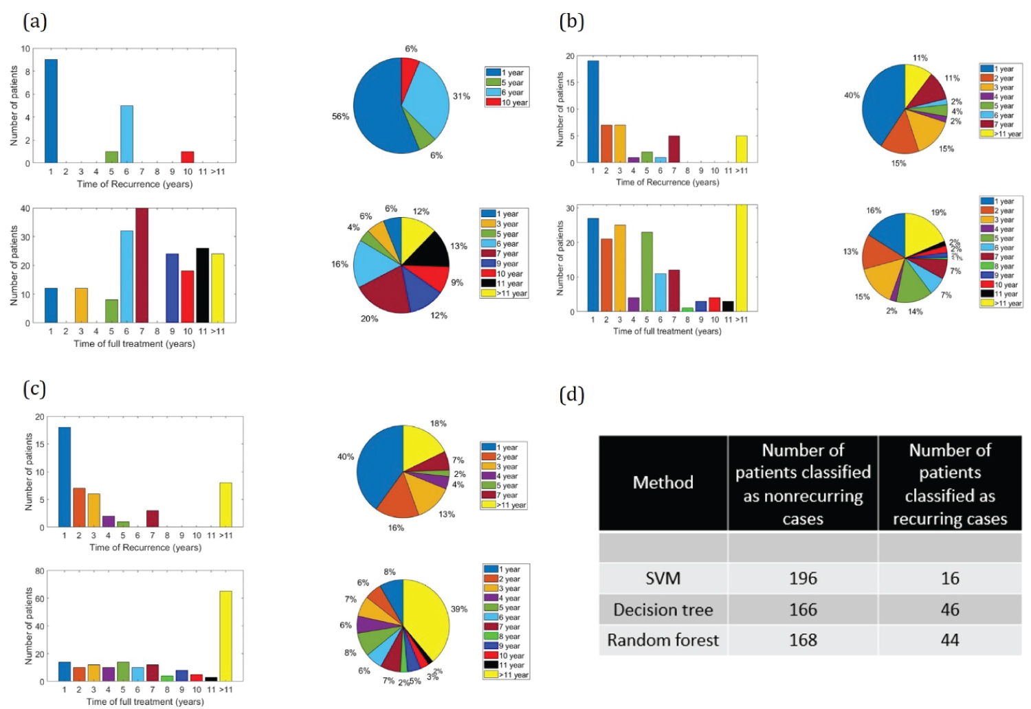 Figure 6: Prediction of time of recurrence/full treatment. a) SVM; b) Decision tree; c) Random forest; d) Number of recurring and nonrecurring cases corresponding to different prediction methods.