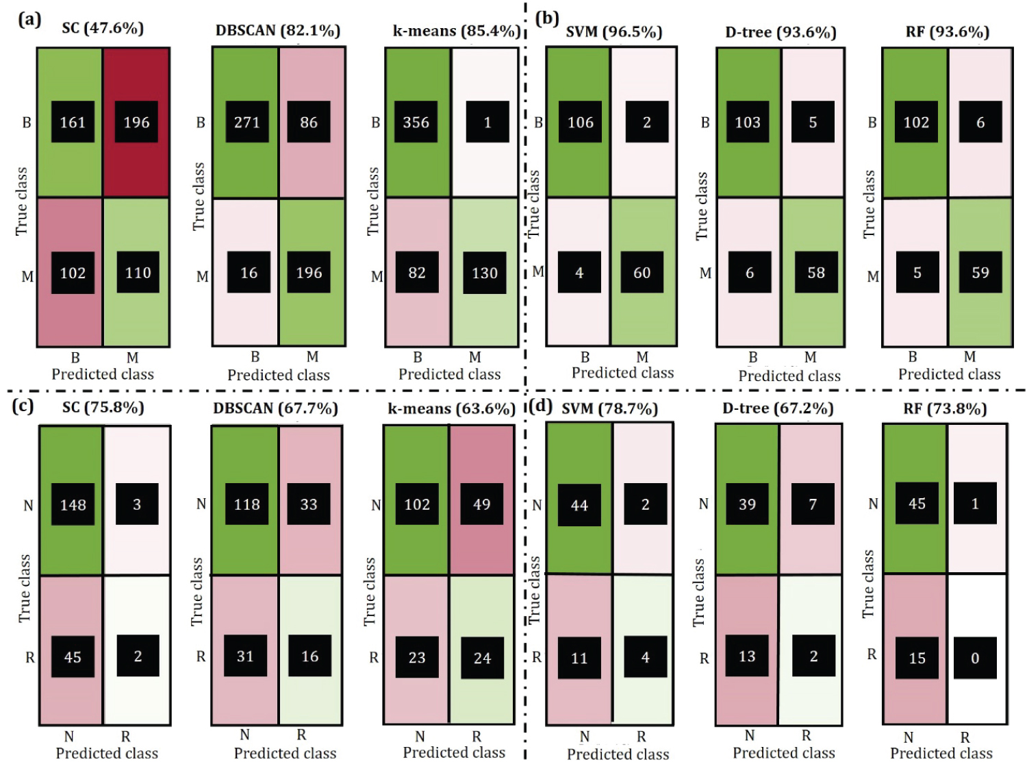Figure 5: Confusion matrix for clustering and prediction where B = benign and M = malignant, N = nonrecurring and R = recurring. a) Clustering on WDBC; b) Prediction on WPBC; c) Clustering on WDBC; d) Prediction on WPBC.