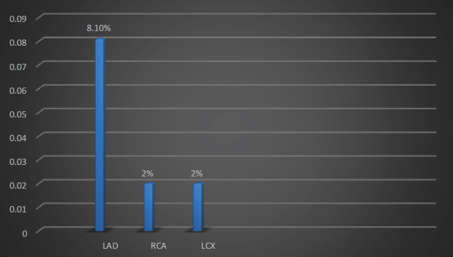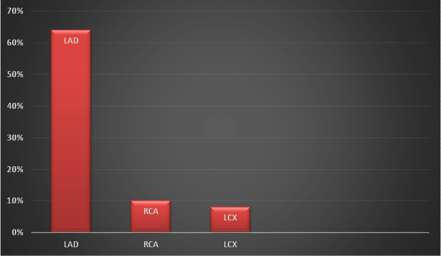 This is an expected finding since the susceptibility of the coronary arteries for occlusion was previously investigated and lately proved that the LAD artery was the most commonly occluded artery among the coronary arteries (42.4%), followed by the right coronary artery (26.8%) then the left circumflex artery (19.1%) [34-36]. Furthermore, lesions were reported to be rare in the right atrial branch, left atrial branch, and posterior left ventricular.