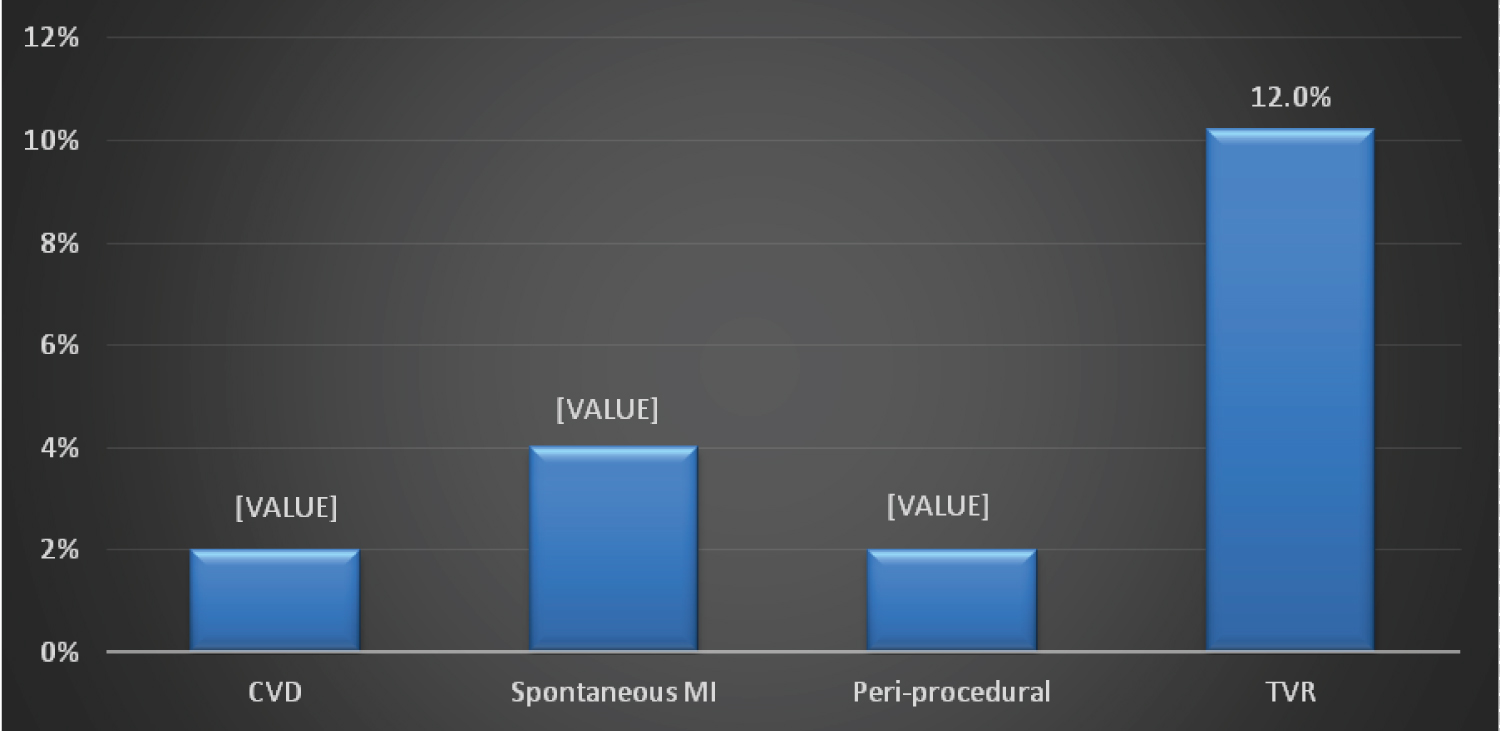 The prevalence of major adverse cardiovascular events (MACE) among our patients at hospital course post intervention was minimal; where only 2% of the patients had target vessel myocardial infarction (one patient had peri-procedural MI).