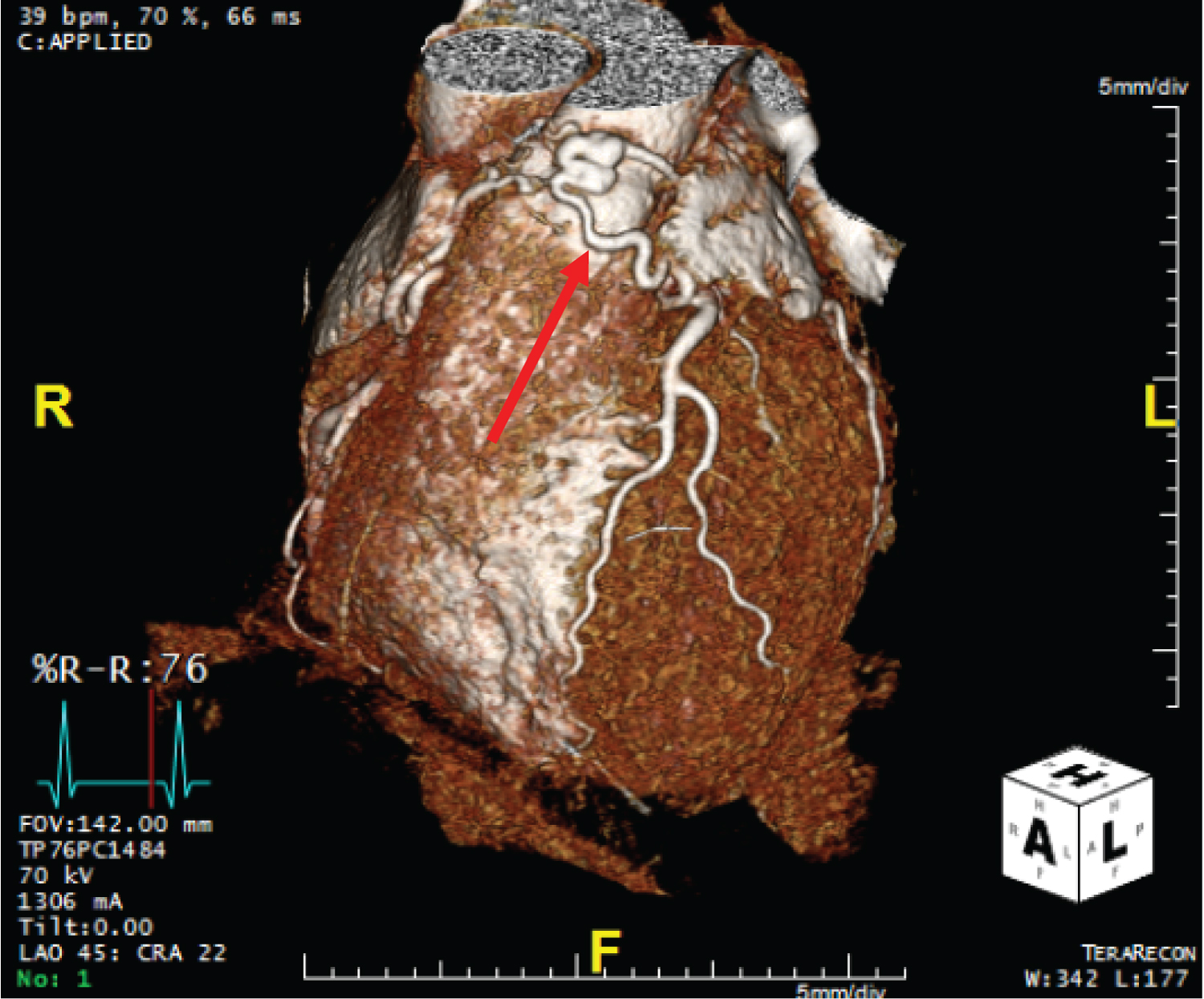 A 56-year-old woman presented to the emergency department with 3 days of intermittent chest pain lasting 30 minutes at a time at rest. The pain was not responsive to sublingual GTN spray and overall felt to be atypical for cardiac ischaemia. Her vital signs on presentation were stable: Blood pressure 107/67 mmHg, heart rate 72 beats/minute, saturations were 96% on room air, respiratory rate of 17 and she was afebrile. Her examination was unremarkable. She had no other medical conditions. However, she did have a strong family history of premature coronary artery disease. Initial bloodwork revealed serial negative troponin I over 12 hours, ECG showed sinus rhythm with non specific ST-T changes in V2, 3. Transthoracic echo revealed normal right and left ventricular function with no regional wall motion abnormalities. Given her strong family history of ischaemic heart disease and her New Zealand Māori heritage we proceeded to an inpatient CT Coronary Angiogram (CTCA). CTCA revealed no significant atherosclerotic coronary disease however; it did reveal bilateral coronary-to-pulmonary artery fistulae (Figure 1, Figure 2 and Figure 3). One fistula from the proximal LAD and one from the conus branch of the RCA. As a result, she proceeded to coronary angiogram to better define these fistulae (see Video 1 and Video 2). We discussed the case at our local heart team meeting between cardiology and cardiothoracic surgery. The consensus was that to justify any intervention, we should demonstrate reversible ischemia in the anomalous vascular territories. A subsequent myocardial perfusion scan performed with exercise showed no evidence of reversible ischemia and the LVEF was 70%. On further discussion with cardiologists from another institution experienced in adult congenital heart disease and the consensus was that these bilateral fistulae were likely an incidental finding although we should observe for development of heart failure or concerning cardiac symptoms. The patient was discharged and attends regular follow up appointments with no recurrence of chest pain to date.