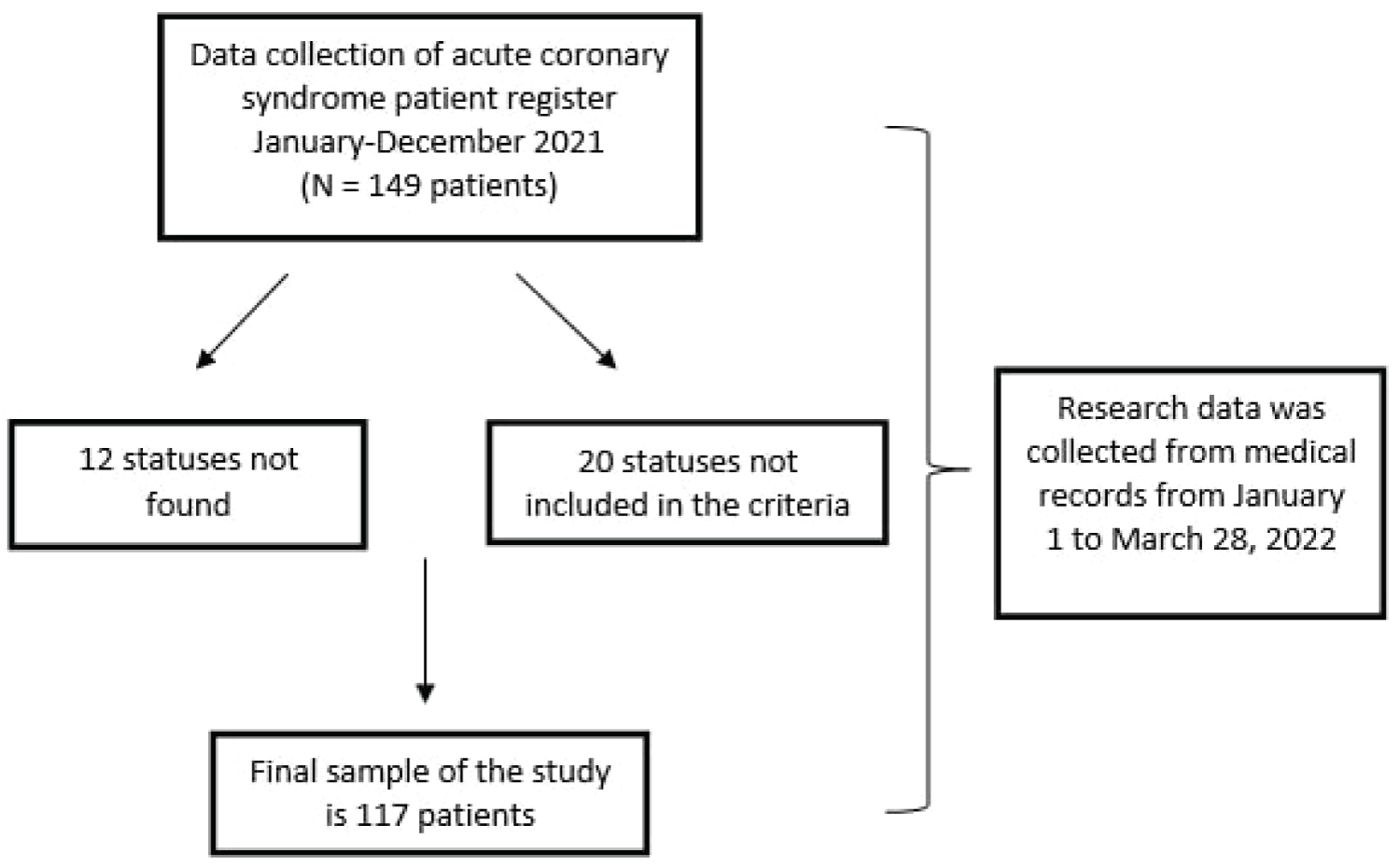 The initial study was carried out by collecting register data for all patients with acute coronary syndrome who were admitted through the ER from January to December 2021. From the data register, there were 149 patients with acute coronary syndrome in the past year. Consequently, a search for medical record status was conducted to collect the necessary data. Out of the 149 statuses, 12 statuses could not be found and 20 statuses were not included in the inclusion criteria. Therefore, the final sample in this study is 117 statuses (Figure 1).