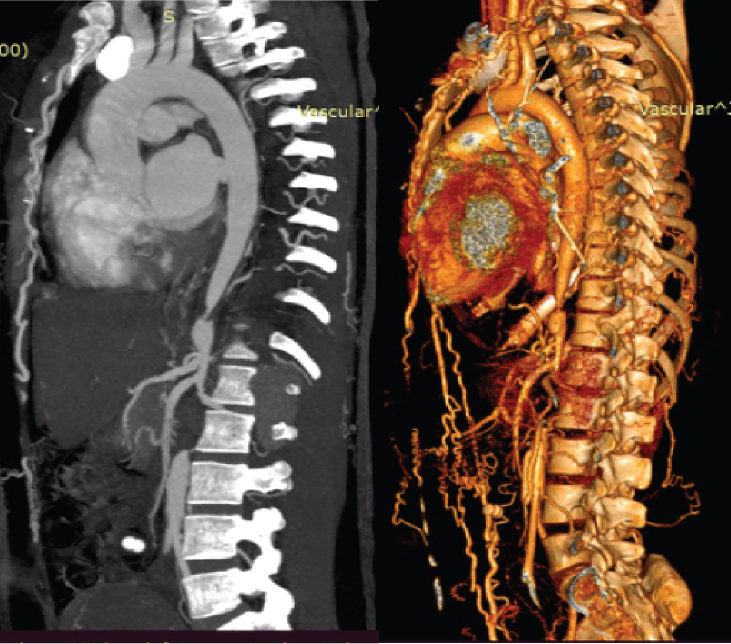 Figure 1: Left side image- CT Aortogram showing short segment of significant luminal narrowing (3.7 cm) in the suprarenal segment of the descending aorta, complete 100% occlusion (length 3.9 cm) in the infrarenal abdominal aorta; Right side image- 3D reconstruction image of the same findings.