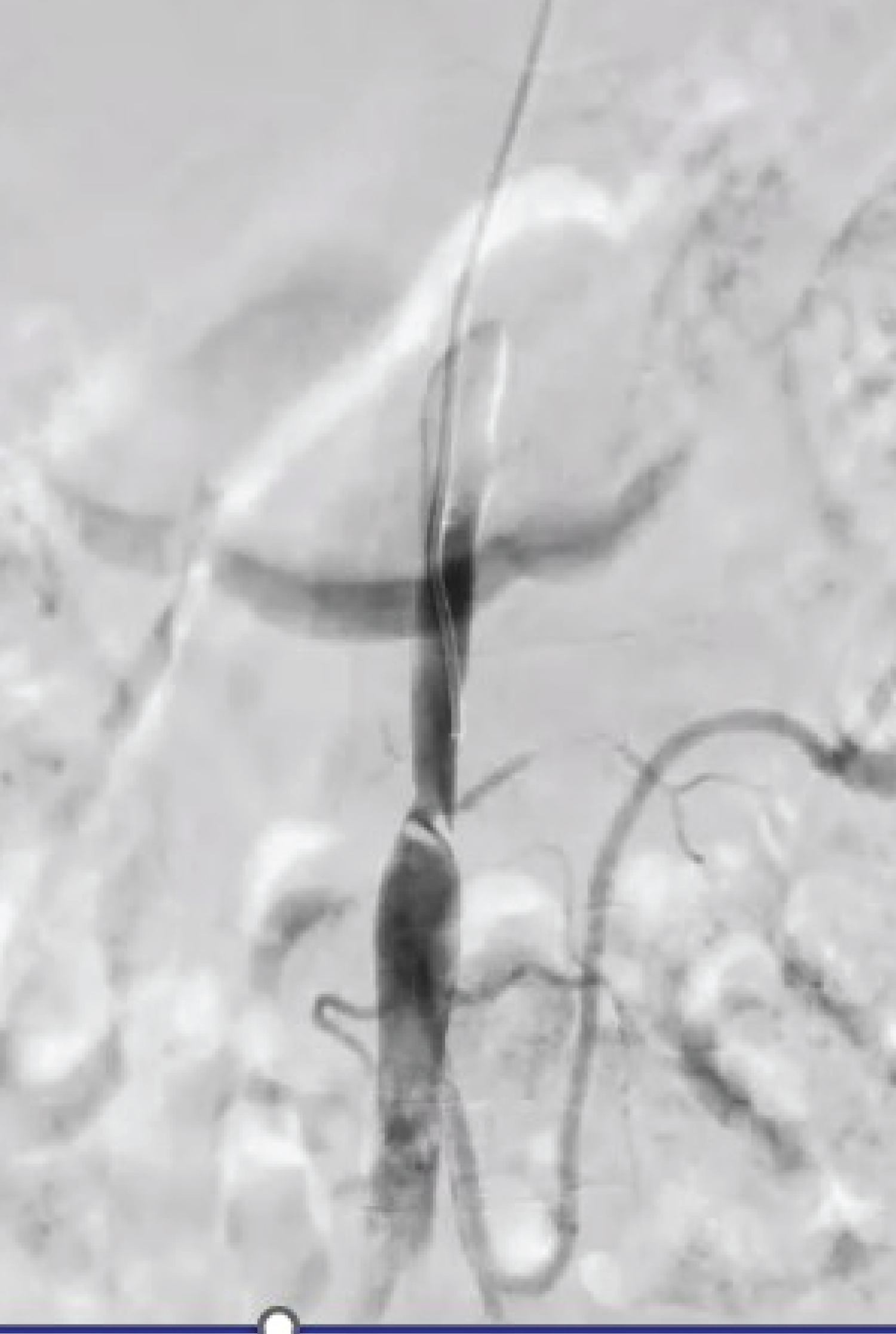 Figure 2: Headhunter catheter passed through the right femoral artery access, revealing a distal flap in the infrarenal part, causing confusion regarding true or false lumen.