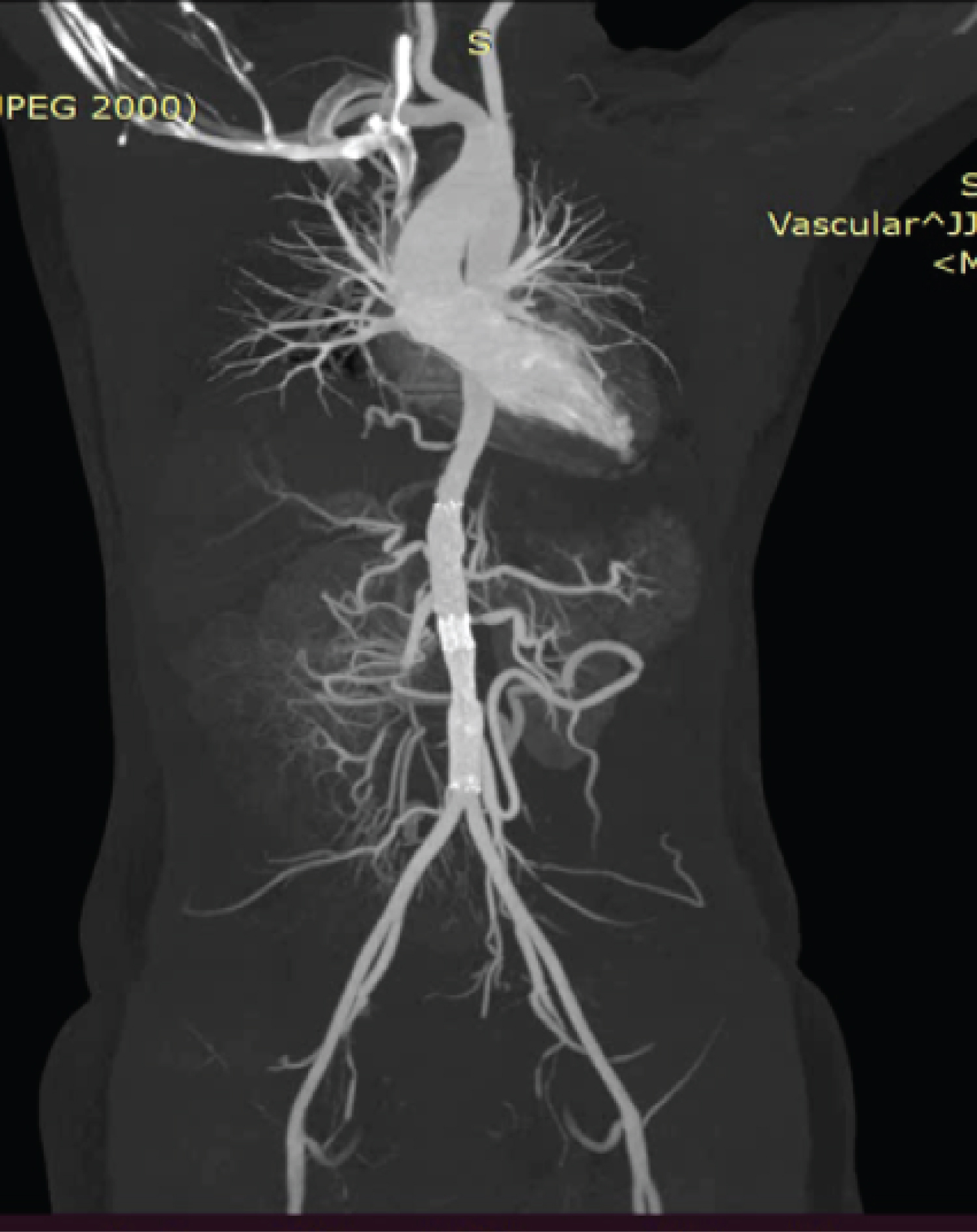 Figure 5: Repeat CT Aortogram revealed a patent stent with good flow, and the celiac, SMA, IMA, bilateral common, external, and internal iliac were normal. There was a critical stenosis (> 80% ostial stenosis) in the left renal artery and right renal artery total cut off from ostium.