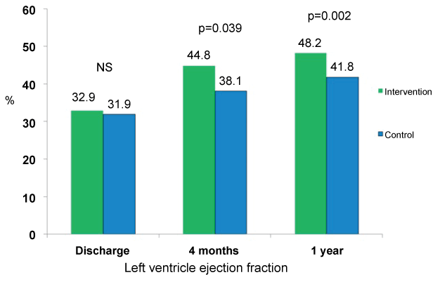 Left ventricular ejection fraction, similar in both groups at admissions and discharge [13], was significantly higher at 1-year follow-up in the intervention group (48.2 ± 17 versus 41.8 ± 10 %, p = 0.002) (Figure 3). BNP values were significantly lower in the intervention group at 4 months follow-up, but no significant differences between both groups were recorded at one year follow-up (300.9 ± 117.4 versus 484.3 ± 137 pg/ml, p = 0.3). A trend to a lower percentage of patient in NYHA class III or IV ambulatory was observed in the intervention group, although without reaching statistical significance (14.8 versus 21.2 %, p = 0.5).