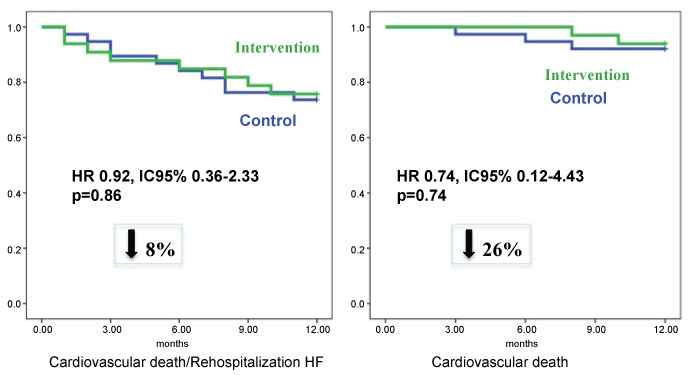 Figure 4: Probability at one year follow-up of not suffering cardiovascular death and/or hospitalization for heart failure (left), and of not suffering cardiovascular death (right) in both treatment groups.