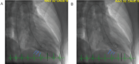 Figure 3: Left ventriculogram in A) Diastole; B) Systole showing mid inferior wall hypokinesis. View Figure 3