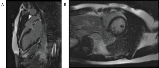 Figure 4: CMR showing absense of LGE A) Two-chamber view; B) Short axis view. View Figure 4
