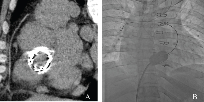 Figure 3: A) CT image before the valvuloplasty shows a highly calcified bioprosthetic valve in the tricuspid position; B) Fluoroscopic image in the anterior-posterior view shows the stiff guide wire passing through the center of the deteriorated bioprosthetic tricuspid valve, with the wire tip in the right pulmonary artery. A balloon valvuloplasty was performed using an Inoue balloon (maximum diameter 26 mm).