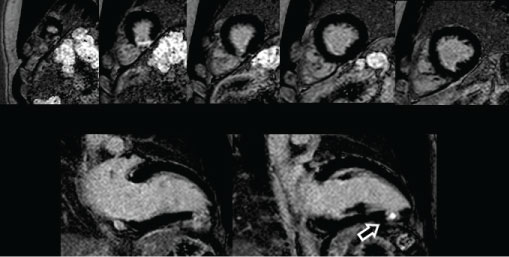 Figure 3: Cardiac magnetic resonance (T1-weighted gradient echo acquisition). Short and long axis views. Late gadolinium enhancement in inferoapical segments, with necrotic ischemic pattern and transmural extension (white arrows).