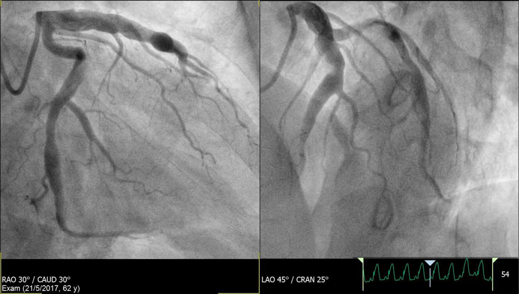 We present a unique case of a 62-years-old gentleman who was admitted for recurrent acute inferior ST-segment myocardial infarction (STEMI) due to recurrent acute thrombosis of a giant right coronary artery aneurysm. Mr ABH had no known prior medical illnesses and he was a non-smoker. He presented to the Emergency Department with complaints of severe chest pressure. A 12 lead electrocardiogram (ECG) showed ST segment elevation in the inferior leads II, III and aVF (Figure 1).