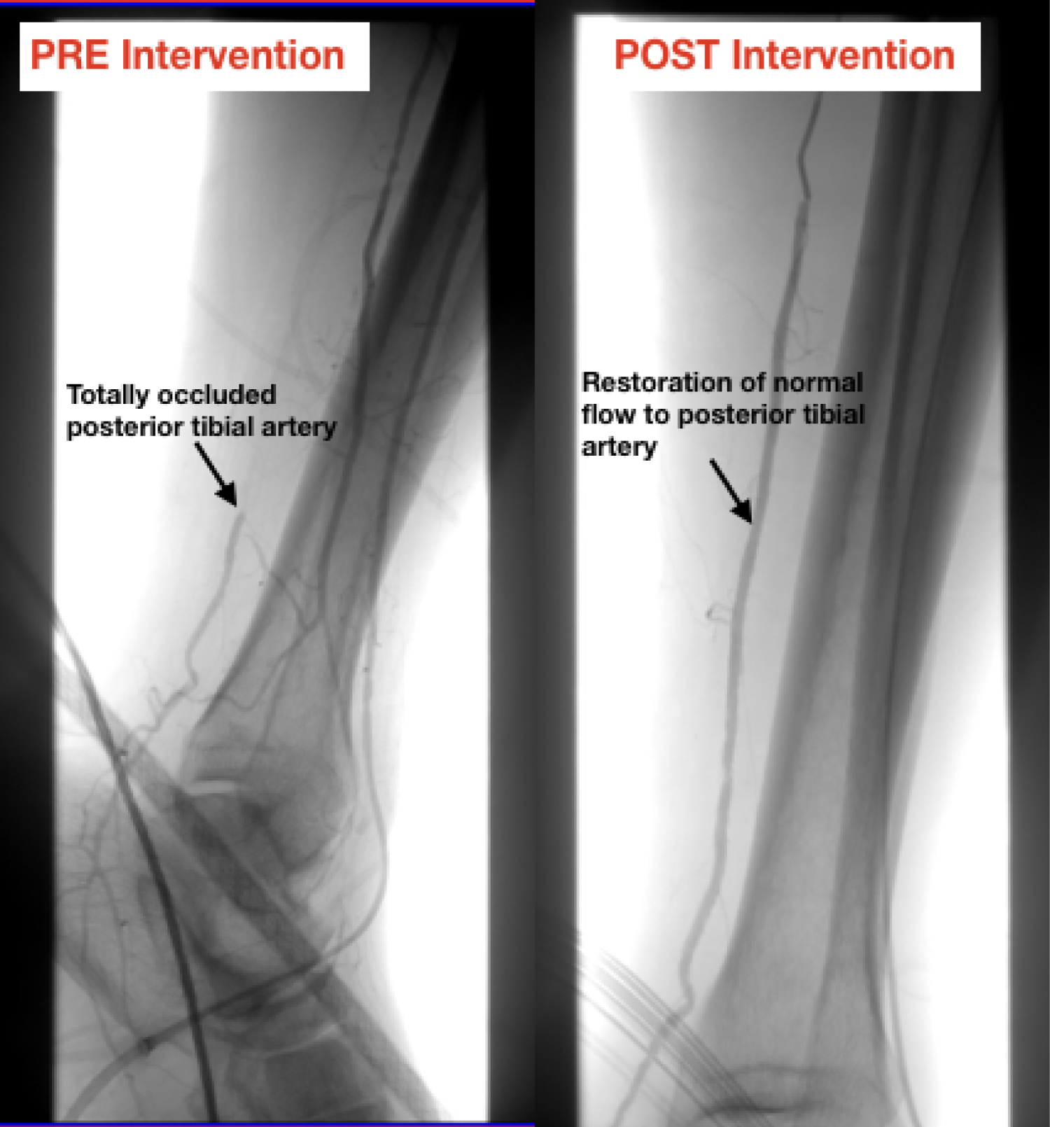 Figure 2: Pre- and post-intervention angiogram. Arrow points to posterior tibial artery, highlighting restoration of normal flow after intervention.