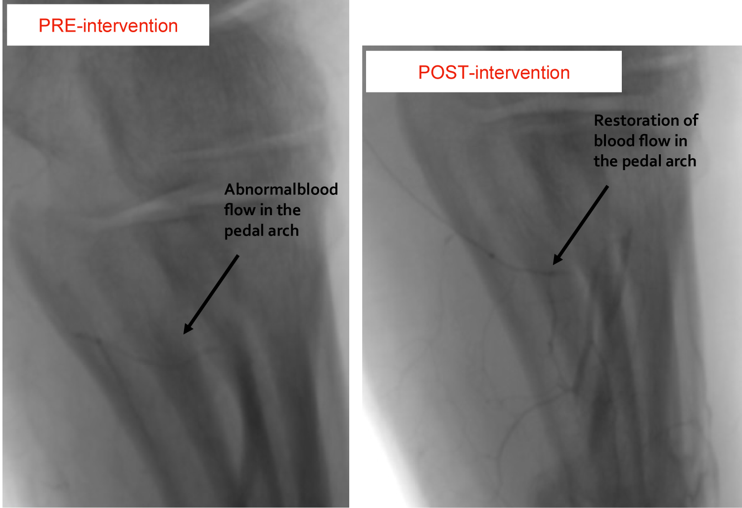 Figure 3: Pre- and post-intervention angiogram. Arrow points to pedal arch, highlighting restoration of normal flow after intervention.