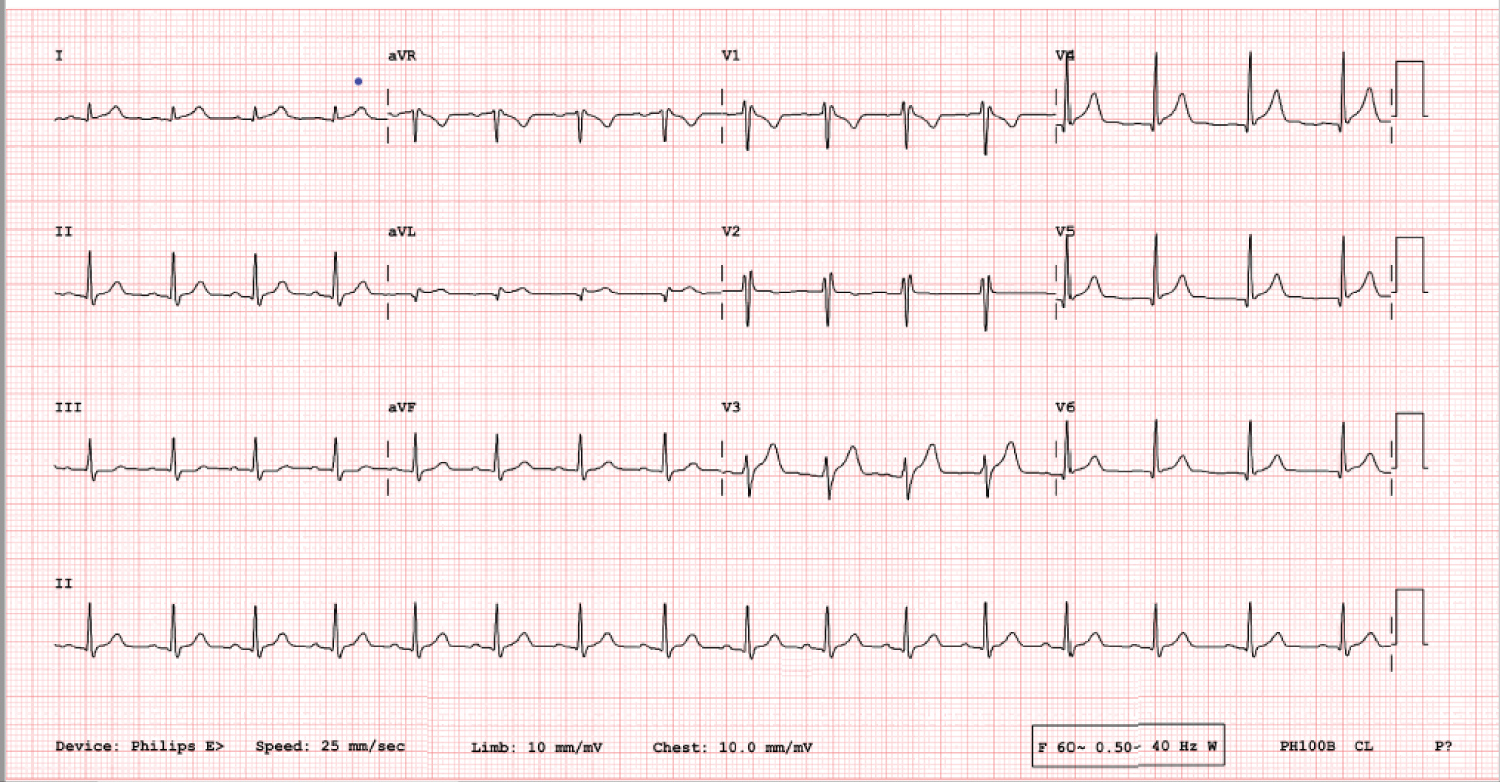 Figure 1: Initial 12 lead EKG showing non-specific ST elevations in anterior and lateral leads.