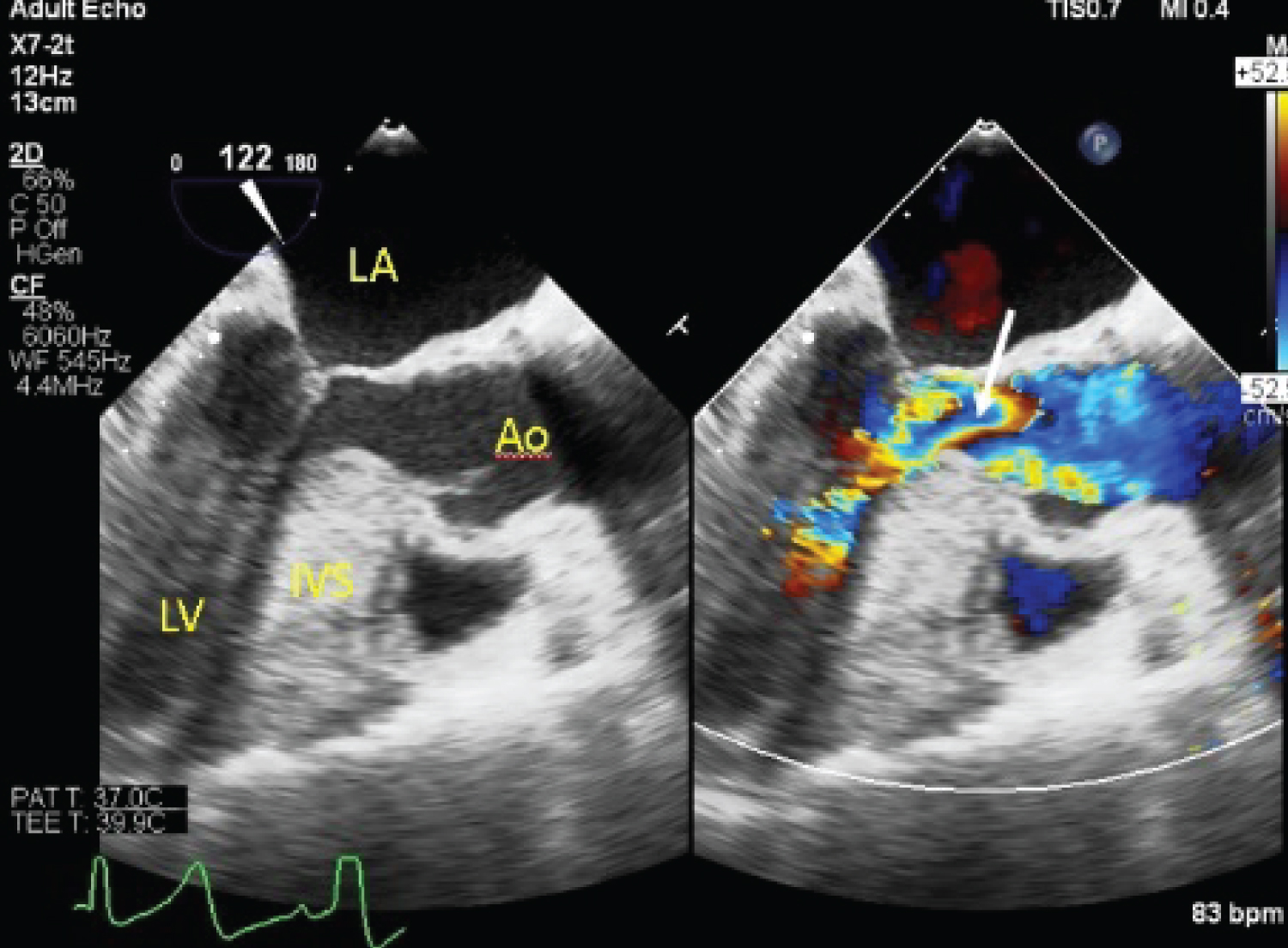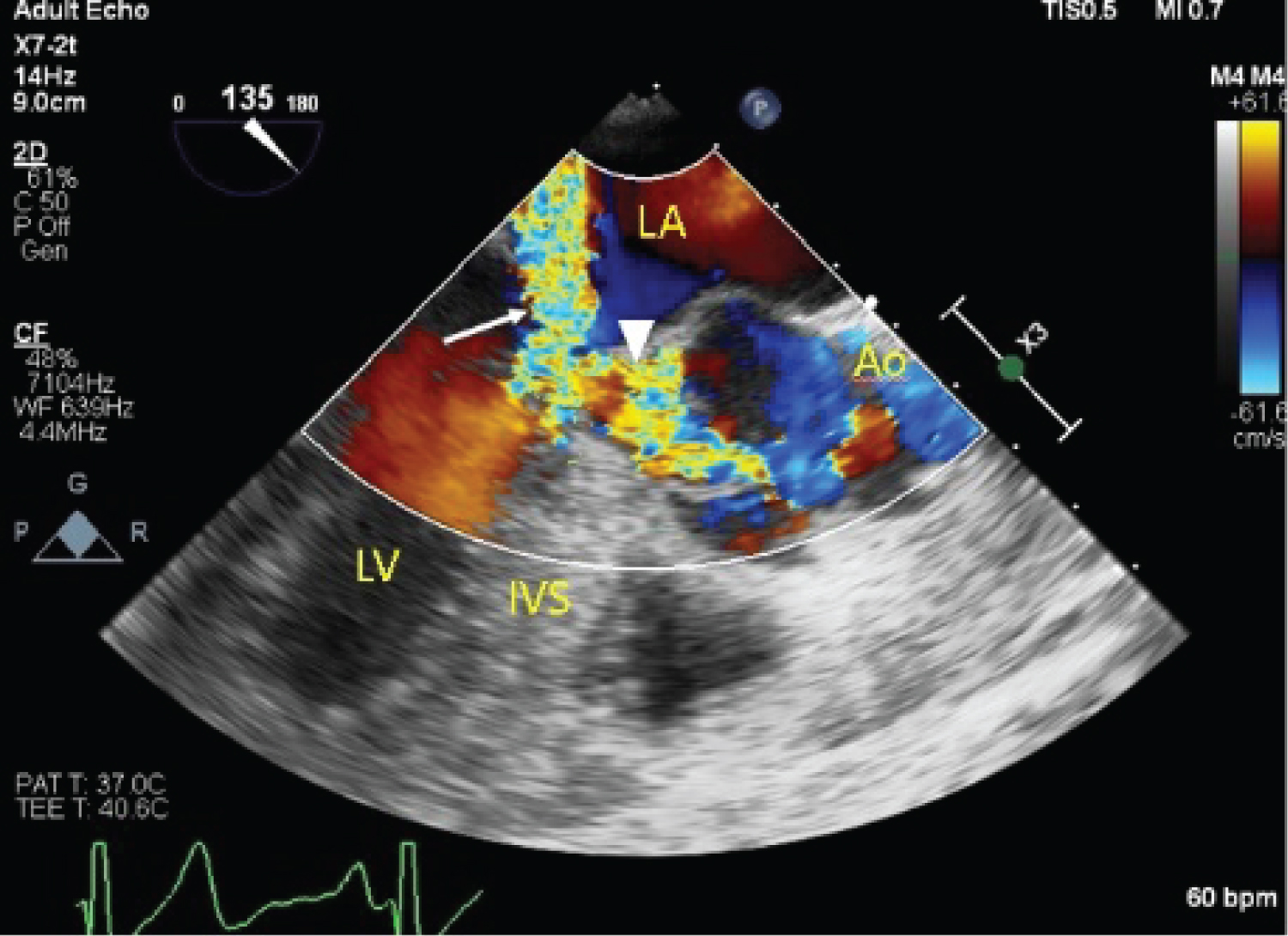 Figure 6: Intra-operative TEE showing LVOT obstruction (arrowhead) and severe mitral regurgitation (arrow).