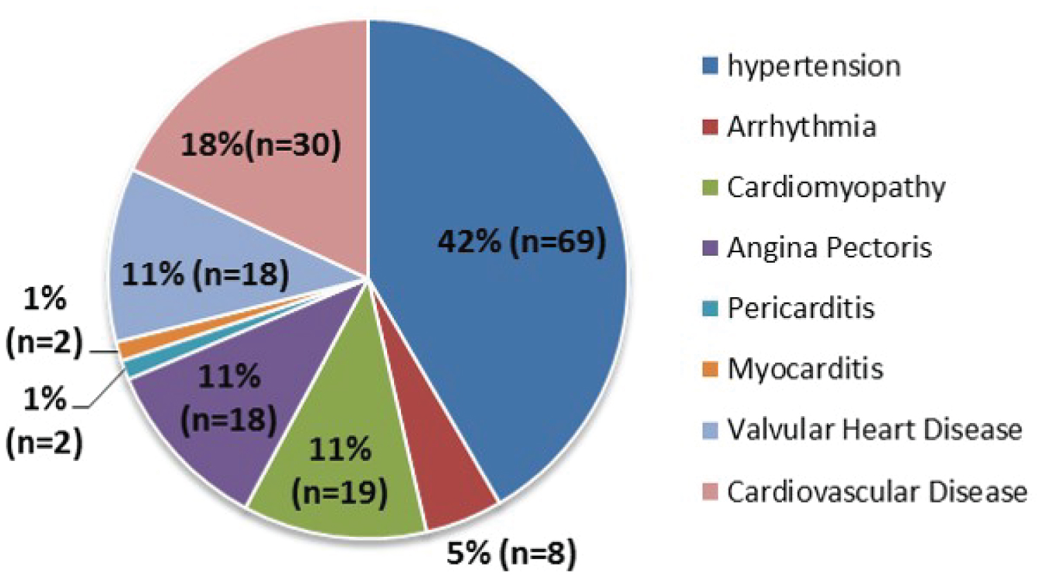 150 questionnaires were filled and the baseline characteristic of heart disease patients (Table 1) include 70% (n = 105) males and the average age of the patients were 60 ± 5 years, the type of heart diseases include 42% (n = 69) of patients had hypertension, 18% (n = 30) of patients had cardiovascular disease, 11% (n = 18) of patients had cardiomyopathy, 11% (n = 18) of patients had angina pectoris, 11% (n = 18) of patients had valvular heart disease, 5% (n = 8) of patients had arrhythmia, 1% (n = 2) of the patients had pericarditis presented and 1%(n = 2) of patients had myocarditis (Figure1).
