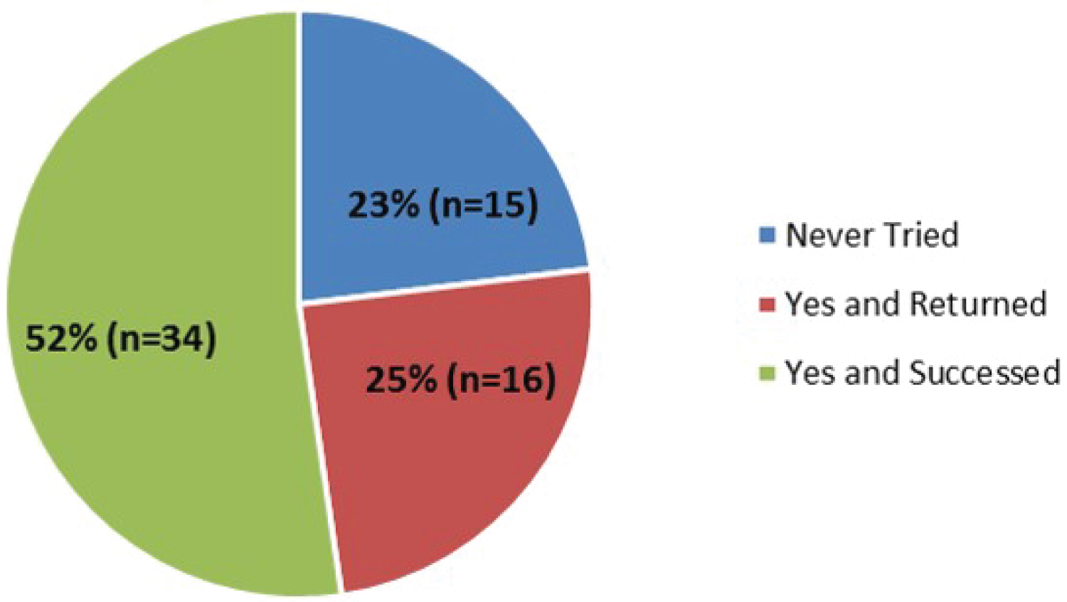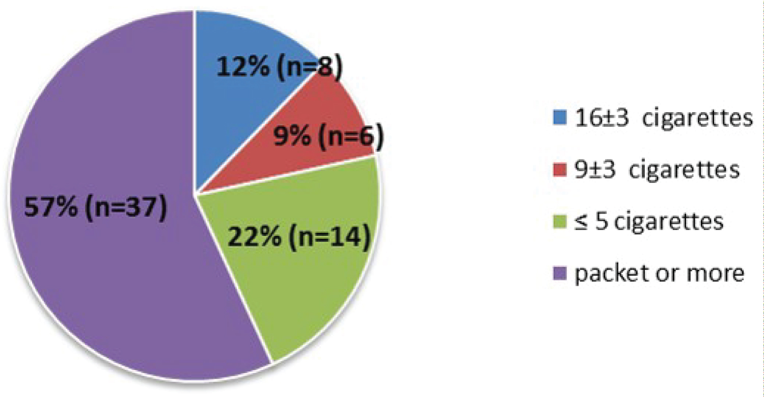 The consumption of cigarette in the 65 patients (actively smoking and patients who quitted smoking) showed that 57% (n = 37) of the patients consume packet or more per day which is the most consumed amount, 22% (n = 14) of the patients consume less than 5 cigarettes per day, 12% (n = 8) of the patients consume 16 ± 3 cigarettes per day and 9% (n = 6) of the patients consume 9 ± 3 cigarettes (Figure 3). Patients’ awareness of smoking risk on the heart was 89.33% (n = 134). The intention to quit smoking was in 76.9% (n = 50) of the smokers, though 52% (n = 34) of the patients succeeded in quitting, 25% (n = 16) returned to smoke and 23% (n = 15) of the patients were not willing to quit (Figure 4). The percentage of smokers who visited smoking cessation clinic was only 10.8% (n = 7).