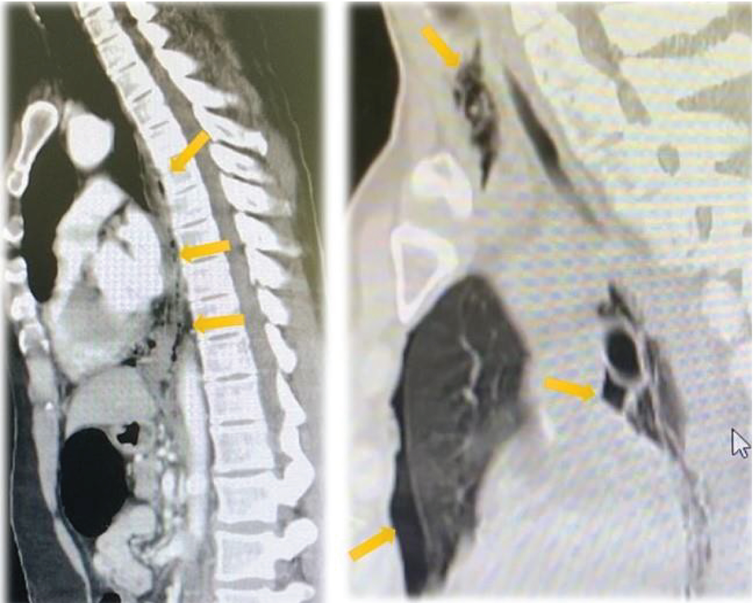 Figure 3: Sagittal view of CT chest showed extra-luminal free air in the mediastinum (yellow arrows) and left-sided pneumothorax.
