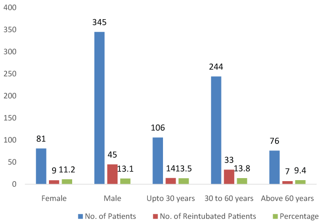 Reintubation percentage was higher in male patients n = 45 (13.04%) compared to the female patients n = 9 (11.11%) There was no significant difference in reintubation according to gender (Figure 1). In our study 14 (13.5%) patient age less than 30 years, 33 (13.8%) patients in age of 30 to 60 years compared to 7(9.4%) patients in age more than 60 years had reintubation. Reintubation rate was more in younger patients (Figure 1). Average duration of intubation was 6 days, no statistical significant difference in duration of intubation and steroid received (Figure 2). Thirty one (10.5%) patients with SOFA score 2-9, 21(17.7%) patient in SOFA score range of 10-15, and 2 (14.2%) patients in SOFA score range of 16 to 19 were reintubated. The percentage of patients reintubated in our study had higher SOFA score (Figure 3). Thirty eight (46.4%) patients reintubated had severe brain injury, 7 (14.3%) had acute abdomen, 2 patients had necrotizing fasciitis. The higher number of reintubation 38 (46.4%) patients was in patients with severe brain injury (Table 3).