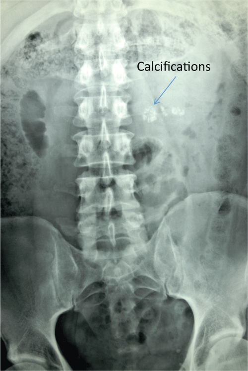 Figure1: Abdominal X Ray accumulation of calcifications in mesogastric level and displayed multiple dilated loops of small bowel.