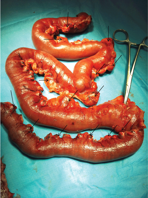 Figure 3: Small bowel resection, clip marks the perforated diverticulum. Arrows mark the multiple diverticula.