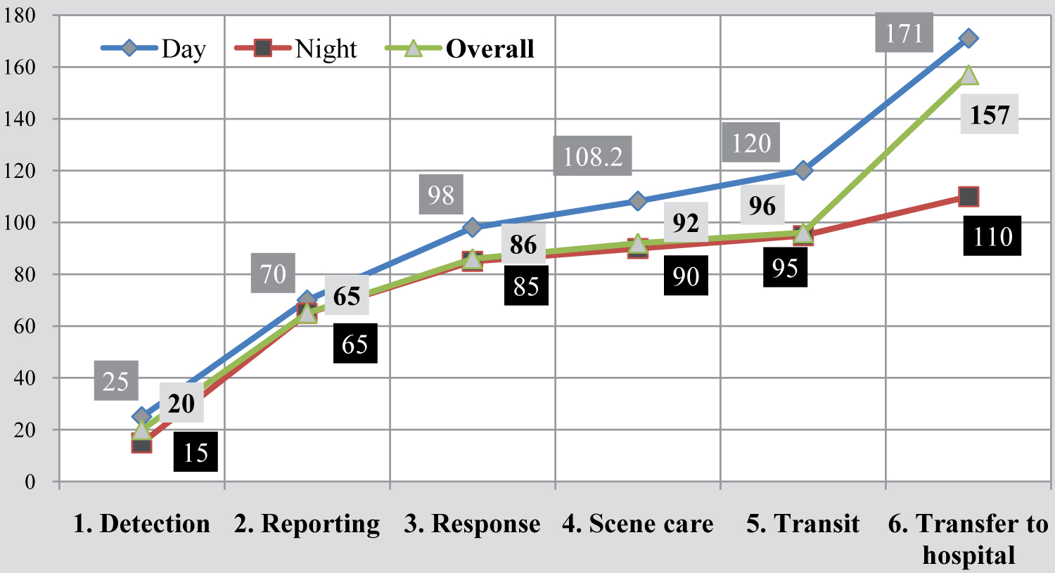 The median delay times of ambulances from the call to getting the patient to hospital was 85 minutes (during the day 102 minutes and at night 45 minutes). The transportation delays were longer for ambulance users (60 minutes) than for local transport users (40 minutes). The total delay (time from the count to arriving at hospital) was unacceptably long: Median delays 360 minutes for ambulance users and 120 minutes for public transport users. This is similar to findings in other studies in Bangladesh [44-46] and in India 80% of the emergency patients arrived at hospitals with a delay of over one hour [47]. This is well above the rule that emergency patients should be treated at scene within 15 minutes [4,19,20,42,48].