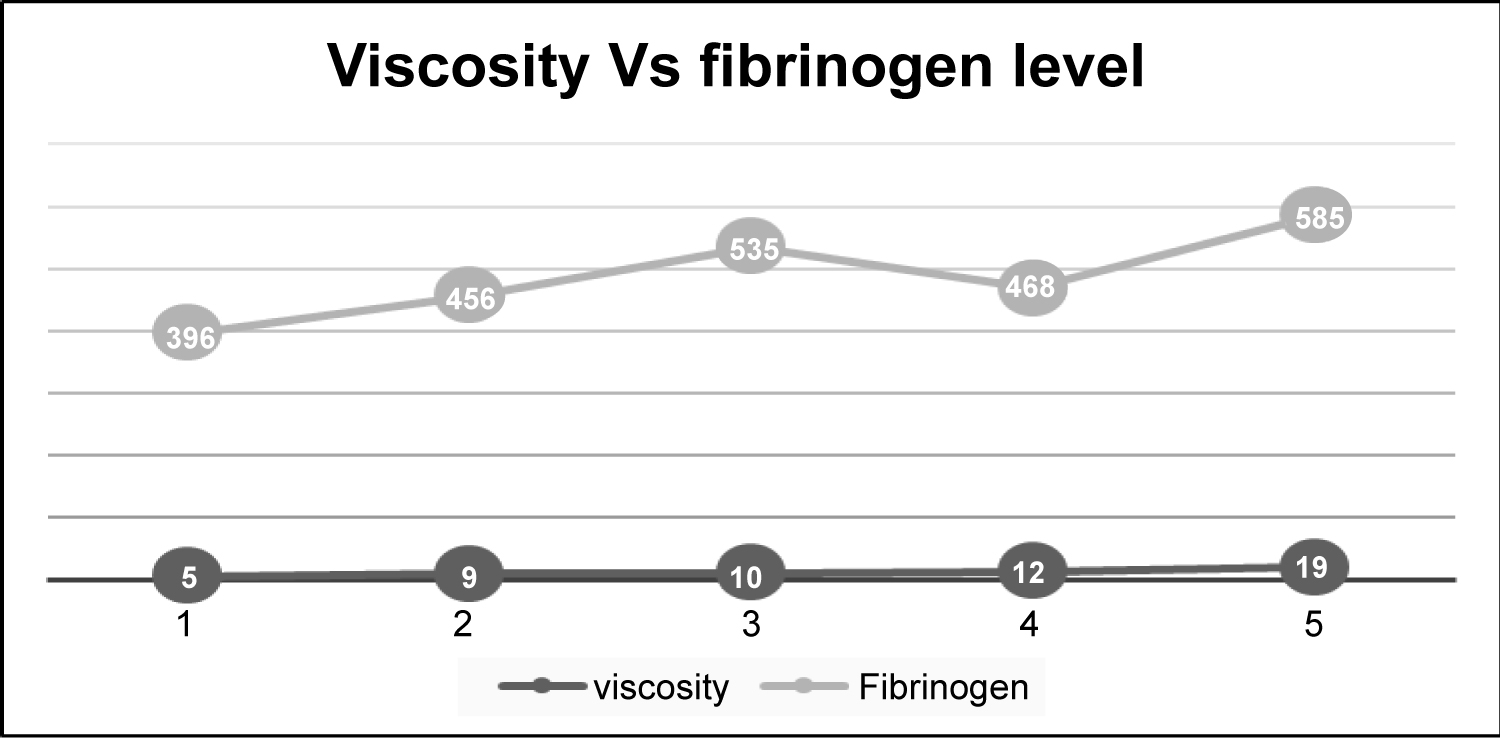 Figure 1: A positive correlation between blood viscosity (cP) and fibrinogen level (mg/dl).