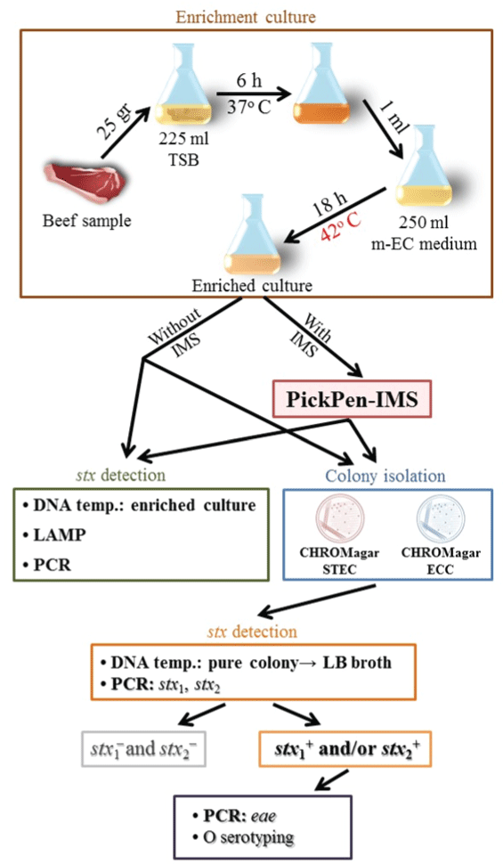 STEC: Shigatoxin-Producing Escherichia coli, EHEC: Enterohaemorrhagic Escherichia coli, stx: Shigatoxin gene, stx1: Shigatoxin gene type 1, stx2: Shigatoxin gene type 2, IMS: Immunomagnetic Separation, IMB: Immunomagnetic Beads, IMBv: Immunomagnetic Beads Volume, bIMBv: Best Immunomagnetic Beads Volume, LAMP: Loop-Mediated Isothermal Amplification, CE: Capture Efficiency