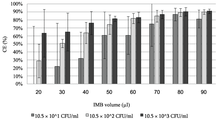 IMBv: incubation time of IMB-target cell mixture (30 min) and PickPen application time (5 min) were fixed. The effect of the combination of various concentrations of the target cells (10.5×101, 10.5×102, and10.5×103 CFU/ml) and the various IMBv (20, 30, 40, 50, 60, 70, 80, and 90 µl) were compared (Figure 2). The average of the CE % was gradually increased and its standard error was reduced with increase in the IMBv. For comprehensive evaluation of IMBv effect, when the result of CE % of the three concentrations of the target cells were combined, the average ± standard error increased from 25.0 ± 47.3 CE % at 20 µl IMBv to 88.4 ± 5.71 CE % at 80 µl IMBv. However, increase in the IMBv from 80 to 90µl had no significant effect on the increase of CE % whereas IMBv increase from 70 to 80µl showed significantly increase CE % for the middle and high concentrations of target cell suspension (p=0.1). Therefore, the 80 µl of IMBv was judged to be the bIMBv. We found, when IMBv was increased to 80 µl or above, the CE value reached a plateau regardless of the cell concentration. Since the ability of IMB to capture the maximum amount of the target cells is limited by the amount of antibodies coating the beads we judged the IMBv of 80 µl (bIMBv) is the most suitable for the studies where the concentration of the target cells is unpredictable. The 80 µl of IMBv is much more than the volume reported by other workers (20 µl) [21,37] and close to the maximum volume that can be handled by the PickPen device in our hands.