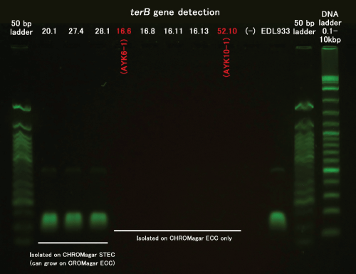 The selective isolation of STEC through CHROMagar ECC but not CHROMagar STEC was also observed in another case (Table 3, AYK10-1) which was also confirmed to be terB- Our result summarized in Table 3 showed that 10 of 12 (83.3%) STEC strains were isolated on CHROMagar STEC but that 2 of 12 (16.7%) STEC strains could be isolated only on CHROMagar ECC. This result is similar to the report by Tzschoppe et al. [15] where 13.6% of EHEC and EHEC-like strains did not grow on CHROMagar STEC. We therefore propose simultaneous use of CHROMagar ECC for the isolation of STEC/EHEC.