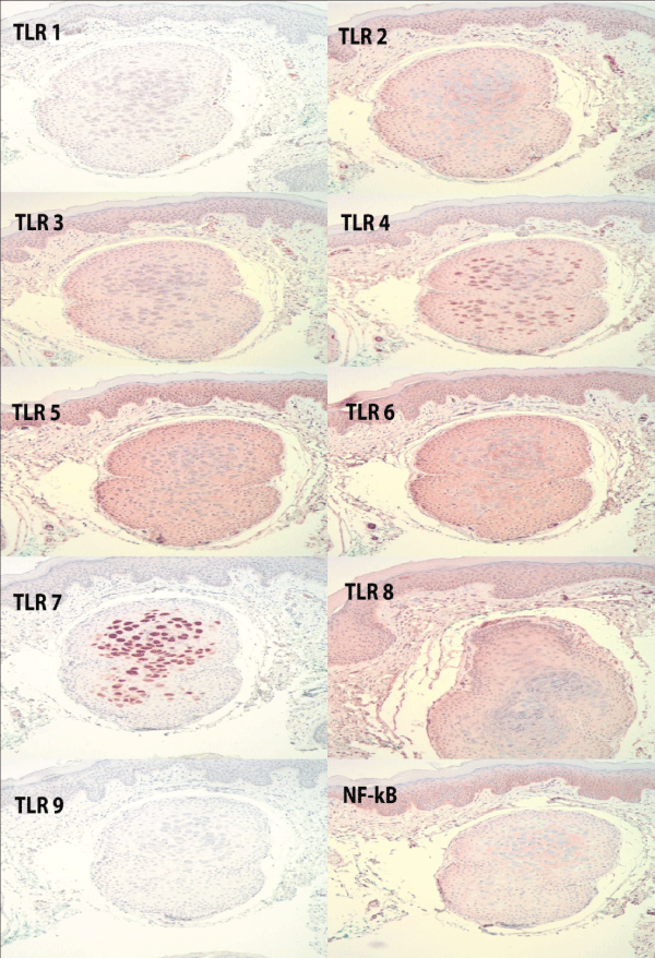 Figure 1: Staining patterns of TLR 1-9 and NF-Kb in a case of molluscum contagiosum, showing increased expression of TLR's 2,3,4,5,6 and 8. There is focal staining of molluscum bodies in the follicular infundibulum. NF-Kb is also expressed. Hematoxylin counterstain; 4x objective.