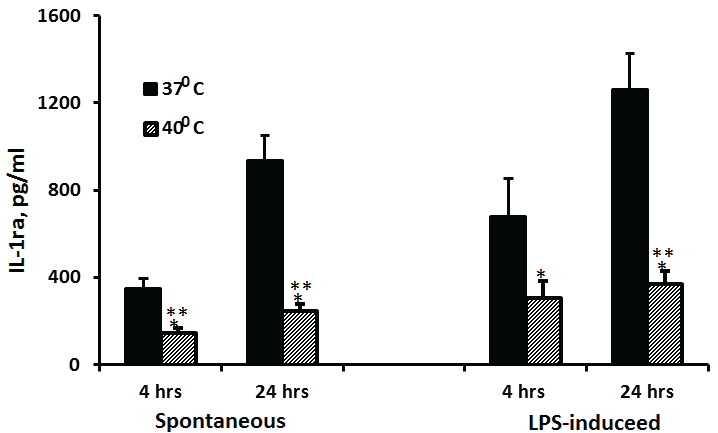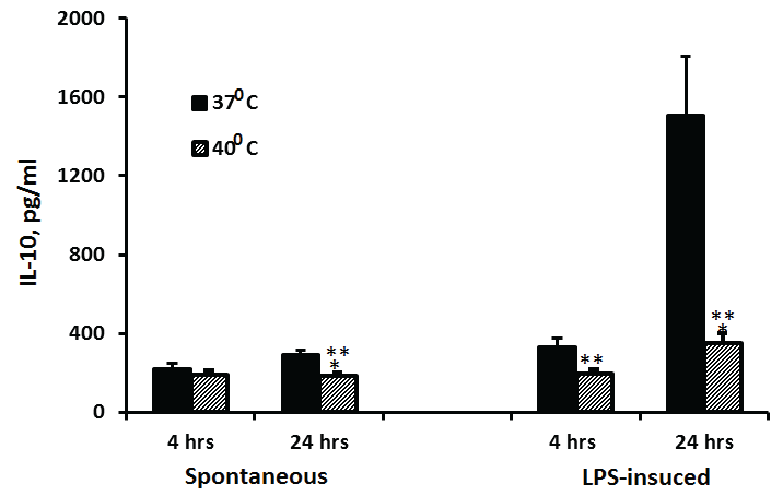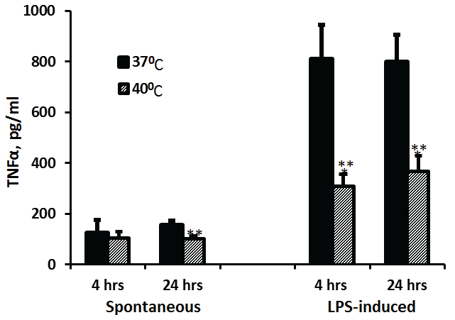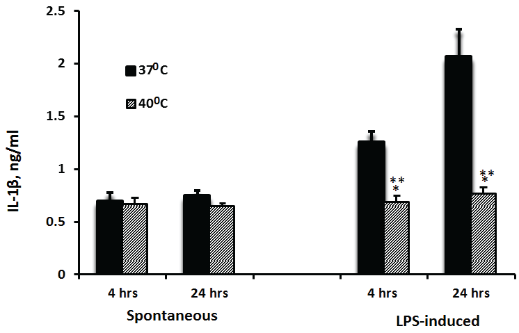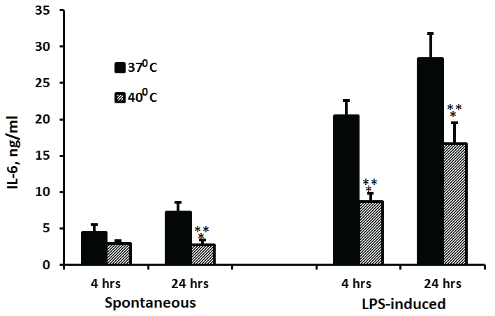 Since centuries ago elevated body temperature has been designated as one of the four signs of inflammation. However, even in now days at the course of everyday practice, existence of temperature fluctuations is one of the first questions the patient is asked for. Increased temperature reflects the occurrence of a number of complex mechanisms including modulation of immune responses that play a major role in the defense against pathogens and other intruders. In this sense mobilization and increased number of peripheral immune cells capable to produce cytokines is imperative for abating the inflammatory process. In a previous study from our laboratory we have shown that isolated human peripheral blood mononuclear cells (PBMC) exposed to 40oC showed an increase in both phagocytic ability and augmented phagocytic index [1]. However, an additional function of the immune cells, i.e. their capacity for cytokine production at elevated temperature merits attention. Lundeland et al. [2] have shown that both hypo- and hyperthermia exert a modulatory effect on whole blood cytokine release. While TNFα production increased during hyperthermia of 40°C that of IL-1β was decreased. Hypothermia of 33°C did not affect TNFα production, but caused an increase in IL-1β release. The generation of IL-10 was unaffected by both hypo- and hyperthermia. Although TNFα and IL-6 are both pro-inflammatory cytokines, it appears that elevated temperature acts differently on their expression. Thus, Ensor et al. [3] have reported that LPS stimulated human macrophages exposed to 40°C for 18 hours did not show difference in IL-6 production compared to that obtained at 37°C. On the other hand, the expression of TNFα was completely inhibited at 40oC compared with the results at 37°C. It is notable that cells, other than immunocytes, may alter their capacity for cytokine production when exposed to elevated temperatures. Thus, hyperthermia combined with glycolipids enhanced the production of pro-inflammatory cytokine release by murine ovarian cancer cell lines [4].