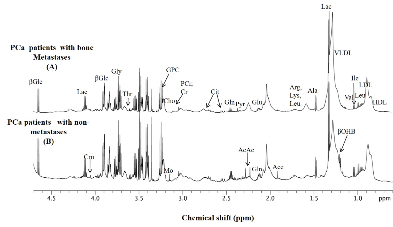 Figure 1: Representative one-dimensional (1D) aliphatic region of 1H NMR (700 MHz) spectrum of blood plasma of a bone metastases PCa patient and non-metastases.