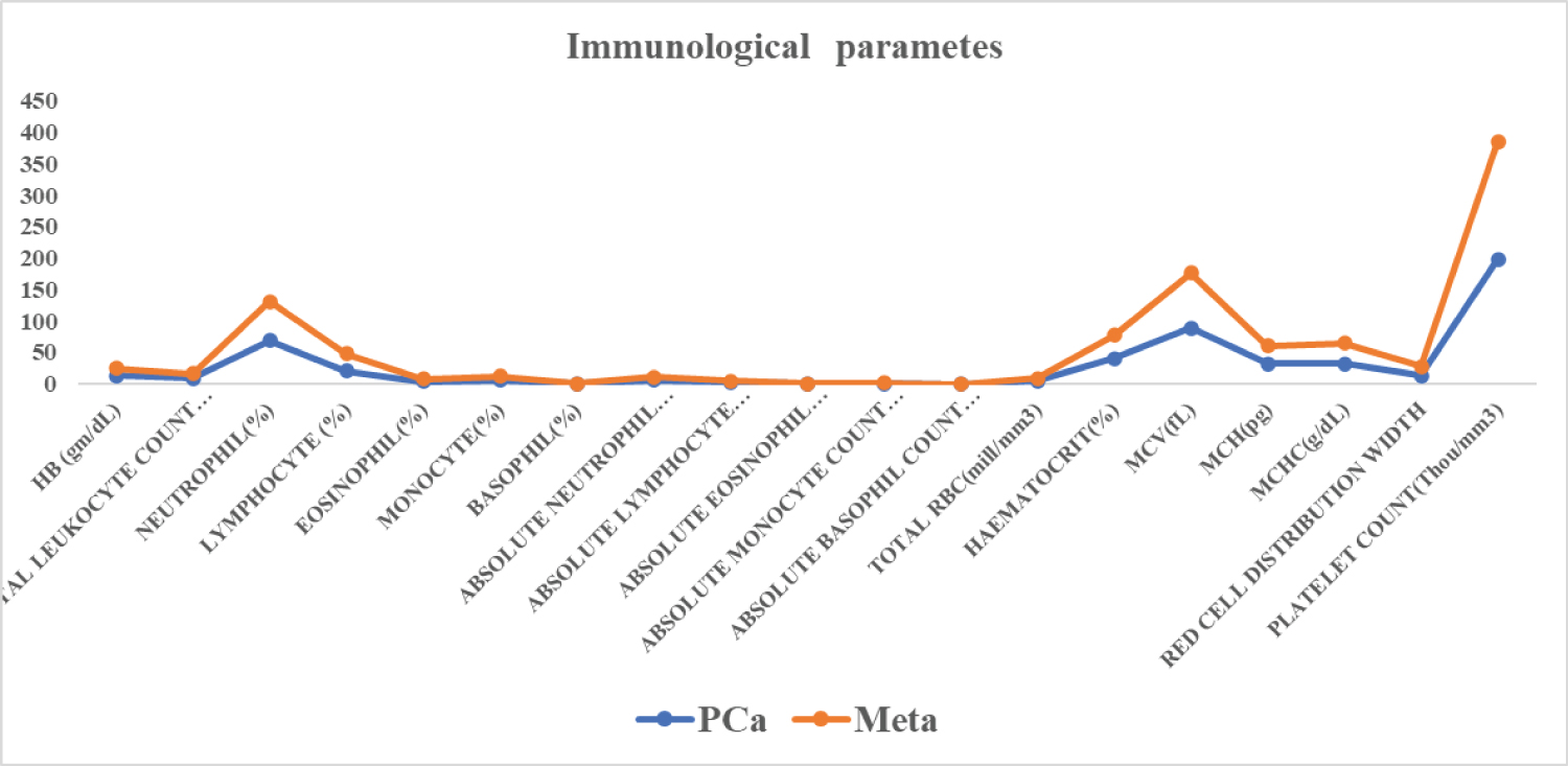 A total of 40 patients diagnosed with PCa were recruited in this study at the Department of Urology, AIIMS, New Delhi. To search for signs of possible metastases to the skeletal locations, a bone scan was performed. Men with age > 40 years with elevated PSA level (> 4 ng/mL) who underwent 12 core TRUS guided prostate biopsy and bone scan. Subjects with high risks of tumors and the presence of bone metastases with higher GS (7 or 8-10) were included in the metastasis group. In another group, no evidence of metastasizing in the bone scan. Patients with diabetes mellitus, hypertension, and other metabolic disorders were excluded. Blood samples were collected from bone metastases patients with PCa (n = 20 mean age: 66.0 ± 8.8 years), PSA: 268 (7.94-20500) ng/mL, and non-metastases patients (n = 20, mean age: 64.6 ± 8.3 years), PSA: 18.28 (5.02-54.40) ng/mL, in morning pre-prandial after overnight fasting. Blood reports of all patients were collected from the Department of Urology at AIIMS, New Delhi. Blood parameters such as hemoglobin (HB) (gm/dL),total leukocyte count (thou/mm3), neutrophil (%), lymphocyte (%), eosinophil (%), monocyte (%), basophil (%), absolute neutrophil count (thou/mm3), absolute lymphocyte count (thou/mm3), absolute eosinophil (thou/mm3), absolute monocyte count (thou/mm3), absolute basophil count (thou/mm3), RBC (mill/mm3), hematocrits (%), MCV (fL), MCH (pg), MCHC (g/dL), and platelet count (thou/mm3) value included in these study. Informed consent was taken and the institute's ethics committee approved the study.