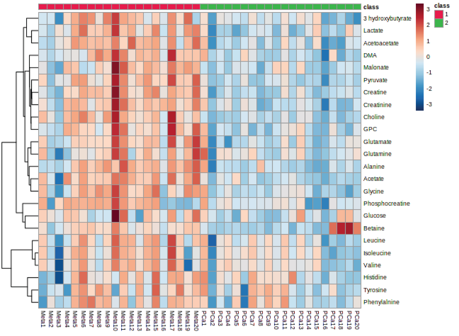 Figure 3: Heatmap analysis of significant metabolites differentially abundant in blood plasma samples of metastases patients with PCa as compared to metastases Patients. Each column shows the metabolic pattern of individual PCa patients in and without metastasis groups. The amount of each metabolite in individual blood plasma samples is expressed as a relative value obtained by the autoscaling method and is represented by the color scheme in which red and blue indicate high and low concentrations of metabolites, respectively.