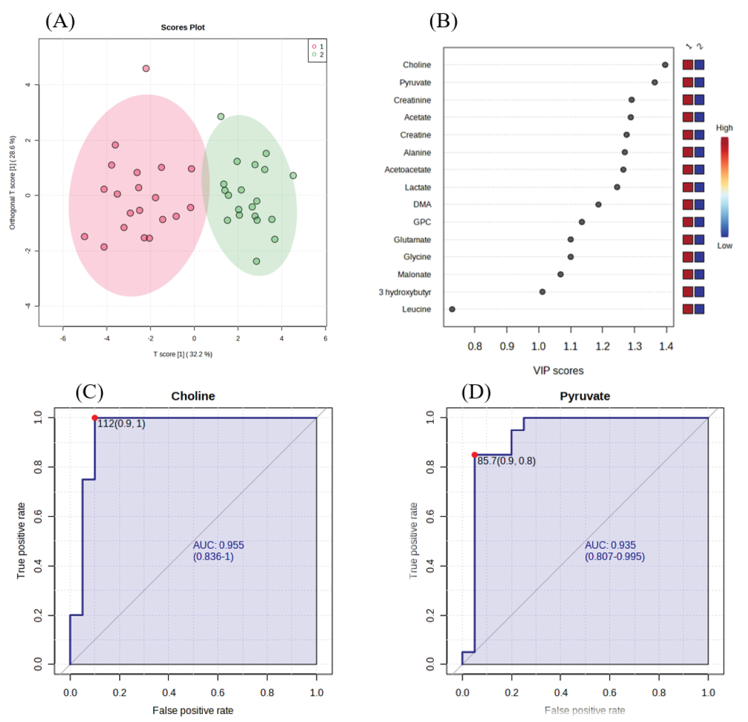 Figure 5: Results of PLS-DAs of metabolic profiles. Score plots obtained in OPLS-DAs of metabolites profiles in blood plasma (A), VIP) scores (B) in two studied groups: metastases PCa (n = 20) and non-metastases patients (n = 20), Univariate ROC curve analysis of choline (C) and Pyruvate (D).