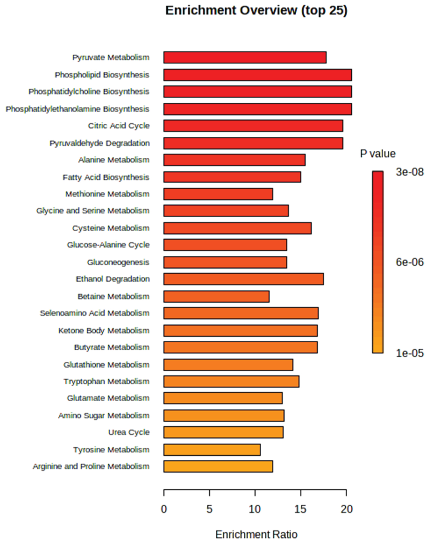 Figure 6: Metabolic Set Enrichment Analysis (MSEA) showing altered significant blood plasma metabolites associated with potential metabolic pathways of bone metastases PCa. Dominated pyruvate metabolism, phospholipids biosynthesis, and TCA cycle were observed.