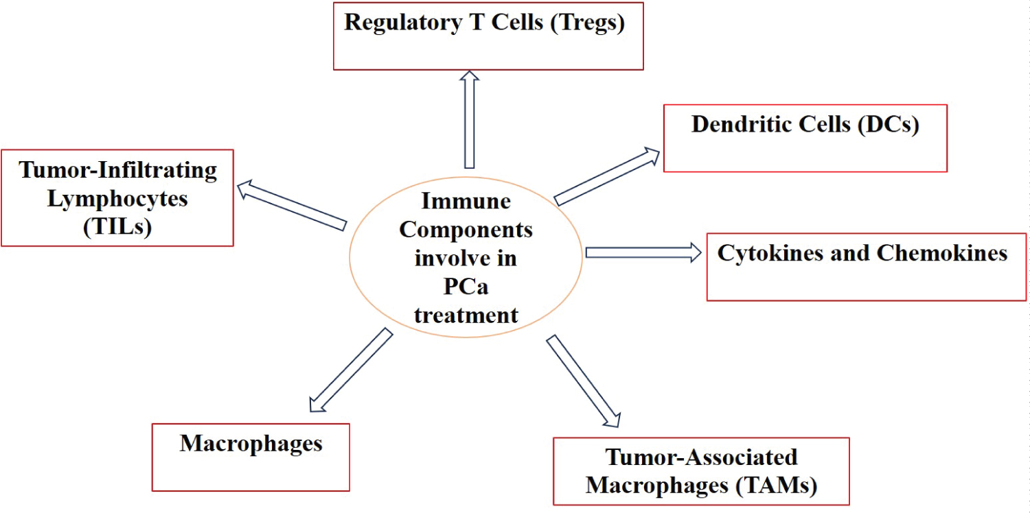 In PCa, the immunological components of the TME are crucial in determining how the disease progresses and if a patient responds to therapy. Tumor-infiltrating lymphocytes, dendritic cells, macrophages, and various cytokines and chemokines all contribute to the complex interactions between the immune system and the tumor. Understanding these components and their interactions is essential for developing effective immunotherapies and improving treatment outcomes for PCa patients. Ongoing research into the mechanisms of immune evasion and the development of targeted therapies continues to provide new insights and potential strategies for harnessing the immune system in the fight against PCa. Summarizes the key immune components present in the PCa microenvironment, and their roles in tumor progression as shown in Table 1. The simple presentation of immunological components linked to tumor-infiltrating lymphocytes (TILs), dendritic cells, macrophages, cytokines, and chemokines in PCa-associated responses and treatment strategies are shown in Figure 1.Top of Form