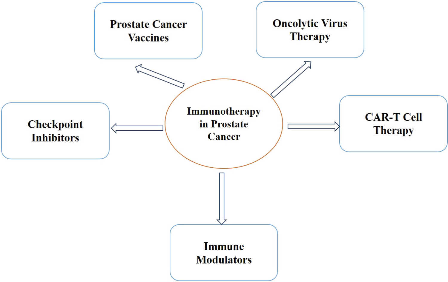 Figure 2: Simple overview of immunotherapy in prostate cancer treatment like checkpoint inhibitors, cancer vaccines, adoptive cell therapy, monoclonal antibodies, oncolytic virus therapy, and immune modulators depending upon the response of the patient condition.
