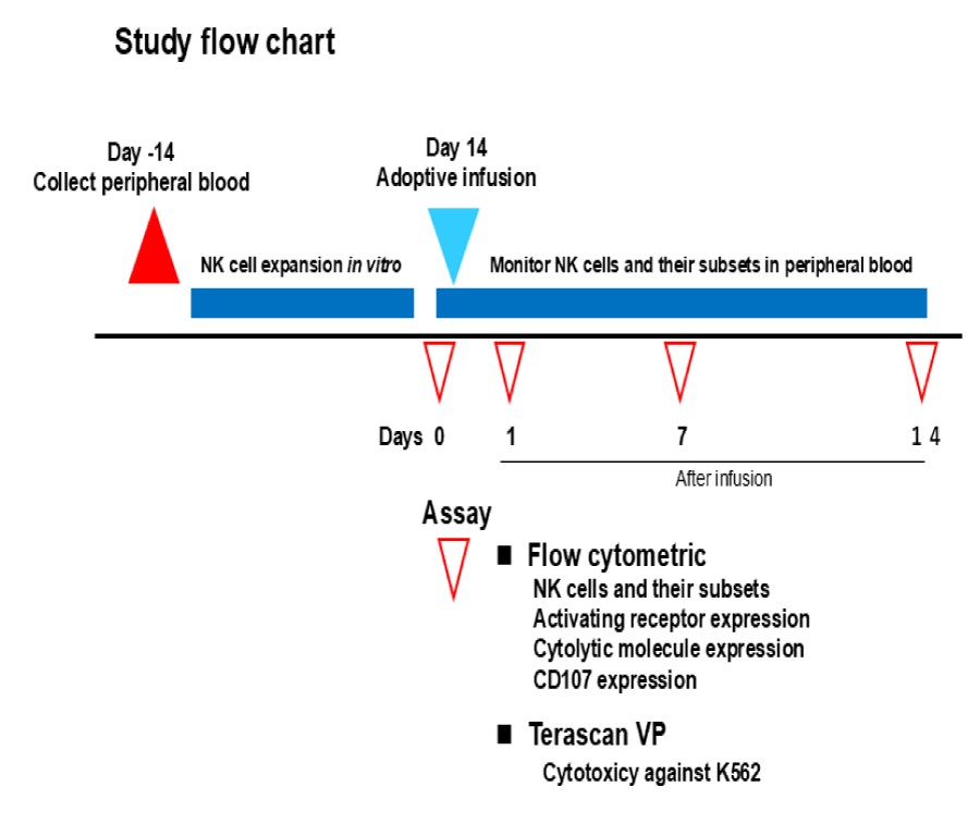 NK cell expansion was carried out at the cell processing facility (CPF) of the Biotherapy Institute of Japan, Inc., which is certified under the Pharmaceuticals, Medical Devices, and Other Therapeutic Products Act (PMDA), Japan. Peripheral blood mononuclear cells (PBMCs) were isolated using density gradient centrifugation with Ficoll-Hypaque (Lymphoprep, Nycomed Pharma, Norway) and cultured in vitro using a feeder-cell-free NK cell culture kit (BINKIT®, Biotherapy Institute of Japan, Inc., Japan) [10]. PBMCs were seeded into activator-immobilized flasks at a density of 1-2 × 10 6 cells/mL and incubated at 37°C in a 5% CO 2 incubator for three days. The cells were then transferred to untreated flasks with fresh NK medium. Fresh NK medium was added every 2-3 days, and cells were transferred to large-scale cell culture bags (NIPRO, Japan) to maintain a cell density of approximately 10 6 cells/mL. After about two weeks of culture, the cells were harvested by centrifugation, and quality control tests were conducted using samples from the final cell culture. Sterility was assessed using prepared medium pour plates with tryptone soya agar (Eiken Chemical Co., Ltd., Japan). Endotoxin levels were tested using the Limulus ES-II system (FUJIFILM Wako Pure Chemical Co., Ltd., Japan). Mycoplasma contamination was evaluated with the Cycleave PCR® Mycoplasma Detection Kit (Takarabio, Japan). Cell number and viability were determined using trypan blue staining. The harvested NK cells were resuspended in 70 mL of Lactec® solution containing human serum albumin and were intravenously injected into the subjects. At the end of the infusion, 50 mL of saline solution was used to flush the pipeline of the disposable transfusion set.